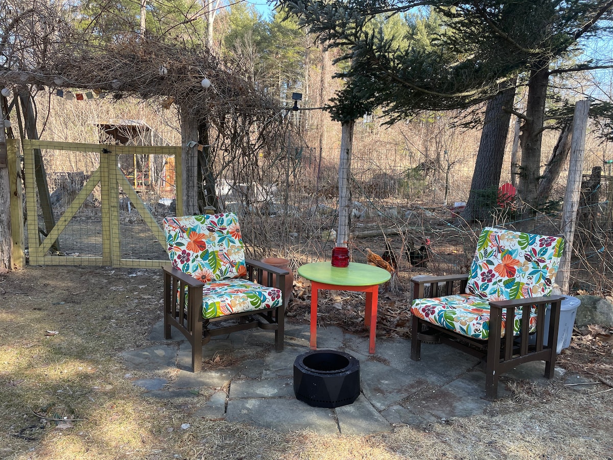 Nyt luksuriøs ferie til nydelige Sharon, CT, bare to timer fra NYC/tre timer fra Boston. Nyt en avslappet atmosfære, utsikt over hagen og fjellene, og ferske økologiske egg fra den nydelige hønseflokken vår. Vi har skapt en luksuriøs og romslig moderne følelse, i en bukolisk jordbruksmiljø. Alt er nyoppusset med et luksuriøst og moderne bad med regndusj og fabelaktig marmorstein. Coyuchi-sengetøy, mykt sengetøy i organisk bomull og gourmetkjøkken!