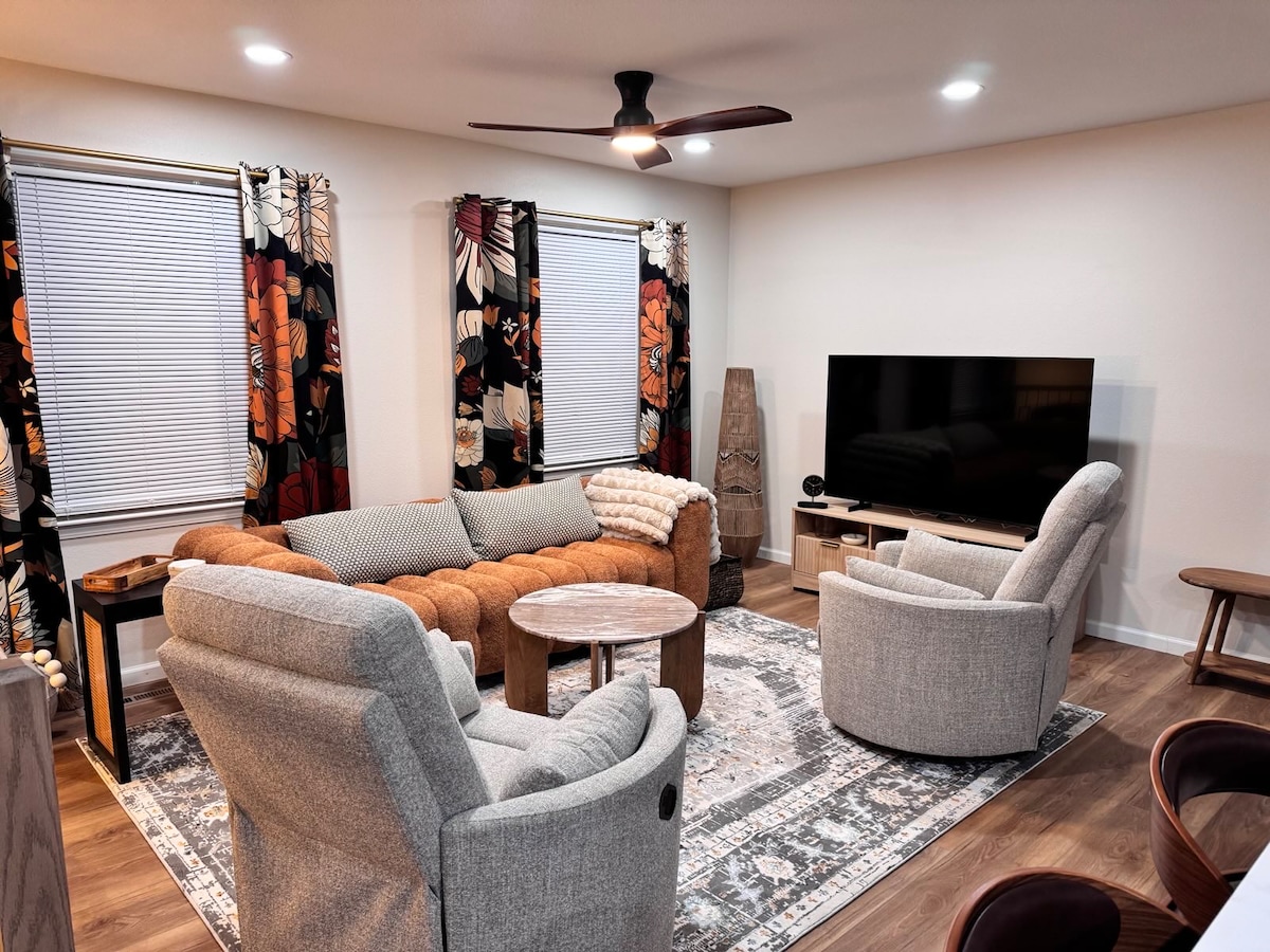Dette hjemmet i ranchstil ligger i et romslig, rolig, eldre nabolag. Den har en veldig åpen utforming som er flott for gjestene å sosialisere seg. Stuen, spisestuen og kjøkkenet flyter alle inn i de tre soverommene rett nede i gangen. Når du ser ut på baksiden av hjemmet, er det lett å glemme at du har naboer. Utenfor stuen er det en koselig, skjermet veranda med trinn som fører ned til en skyggefull uteplass. Kjelleren har åpen plass med biljardbord, hjemmekino, vaskeri og et fjerde soverom.
