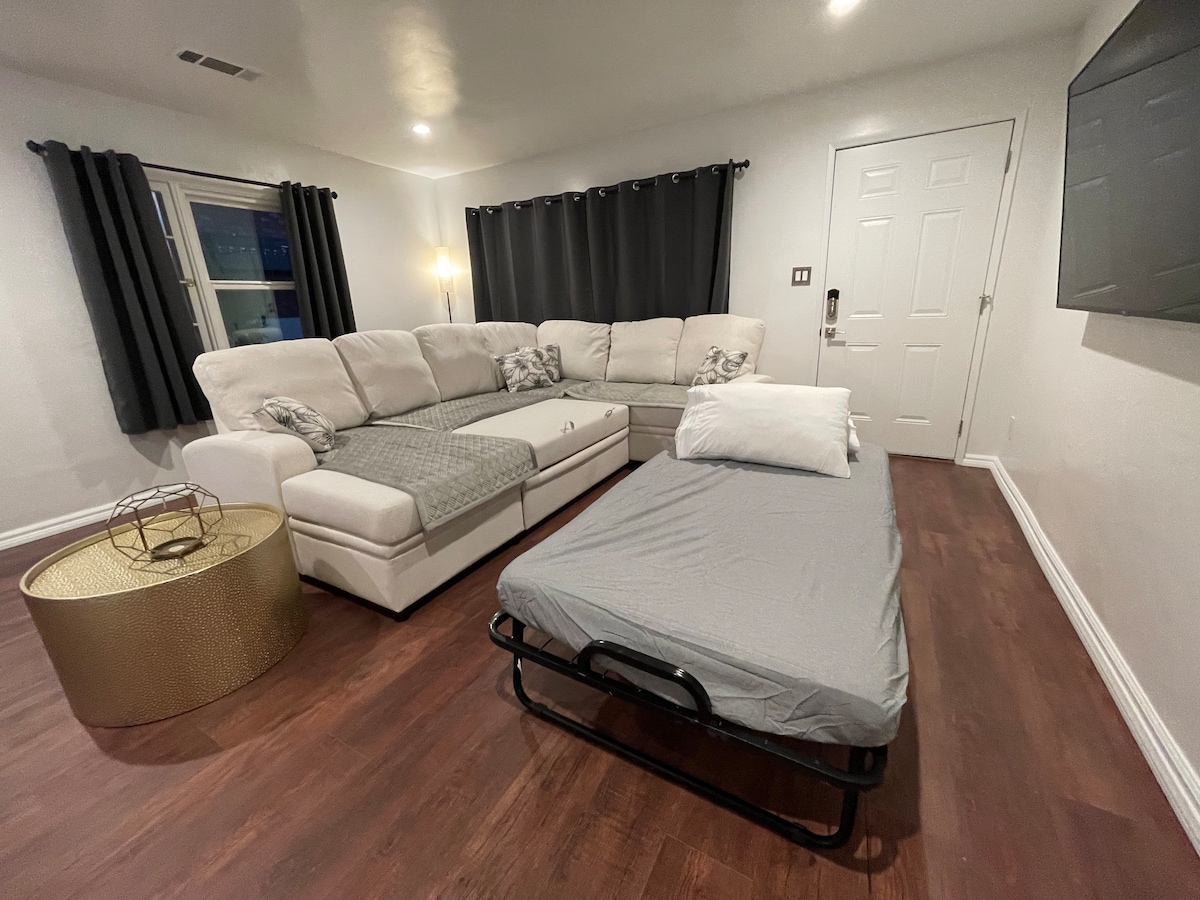 INGEN RENGJØRINGSGEBYR! To miles fra Universal Studios! Nytt gjestehus frittstående fra hovedhuset (ingen plass eller vegger annet enn parkering er delt!) perfekt for en familie på fire personer, par eller bedrift. Svært trygt område, inngjerdet parkering! I nærheten av Burbank lufthavn, gangavstand til et døgnåpent Vons/CVS-apotek. Veldig nær Hollywood Bowl, Disney Studios, offentlig transport og restauranter. Sentralt klimaanlegg. Raskt trådløst nettverk. Mørkleggingsgardiner! **kjæledyr bor gratis!**