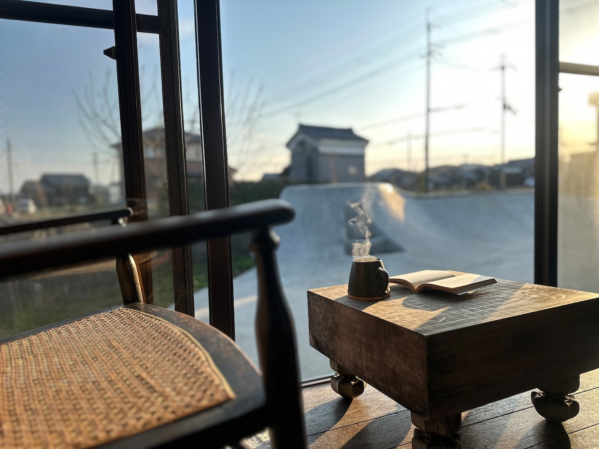 A quiet private stay in rural Japan, one hour from Kyoto. A traditional house, slowly renovated by the host, a Japanese painter, into a modern teahouse-inspired space. The garden includes a small handmade skate landscape, like a sculpture. No experience needed. Surrounded by fields, with sounds of birds, wind, and water. Stars at night. A place to slow down, breathe, and reconnect. Ideal for writing, creative work, and quiet stays. 2+ nights recommended.