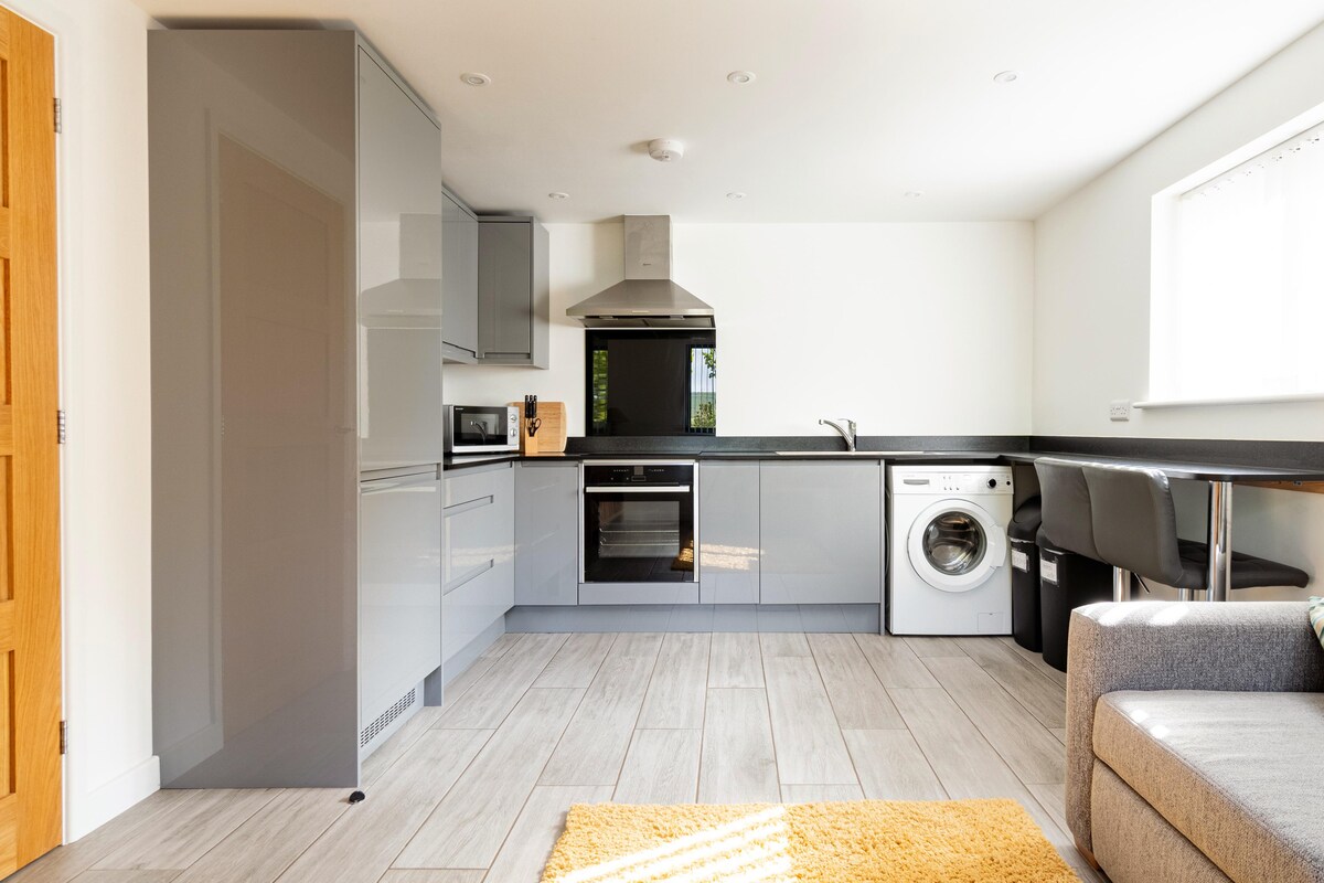 Nybygd, moderne tre-roms bolig i åpen planløsning utenfor Exeter, med høy kvalitet, soveplass til fem. Stort, moderne kjøkken med spisestue og stue med utsikt over den fantastiske Devon-landskapet, elven Exe og havet utenfor. Det er to bad, ett med en stor, dobbel dusj. På en vakker dag kan du sitte og slappe av med et glass eller to på den overbygde balkongen og se på det fantastiske dyrelivet (hjort, fasaner, glenter, hauker, spetter osv.). I nærheten av Exeter, Dartmoor og lokale strender. Privat hage.