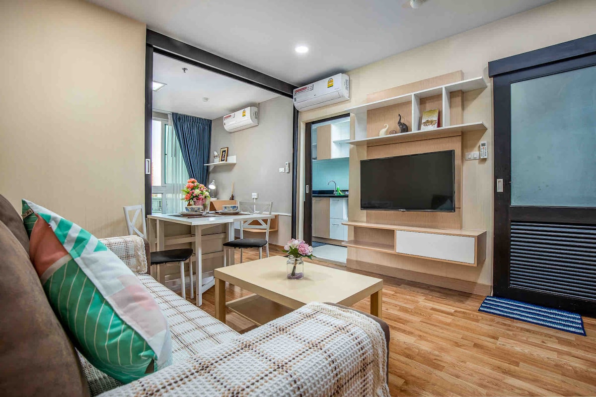Studioleilighet med møbler og fasiliteter. Ligger i Siracha sentrum med panoramautsikt over sjø, fjell og by. Enkel spasertur på et minutt til Koh Loy Park, Atara Mall, restauranter og Fresh Market. 150 meter til Phayathai Sriracha sykehus. 300 meter til Robinson kjøpesenter (stasjonen for offentlig varebil til Bangkok er her). 1,5 km til Central kjøpesenter. Langdistansereiser kan ta motorsykkel og tuk tuk på Atara kjøpesenter eller ringe applikasjonen Grab/Bolt. * Spesialpris for ukentlig og månedlig leie. * Språk: thai-engelsk-kinesisk. 热烈欢迎入住我们公寓