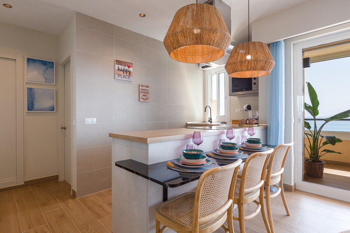Benalmádena-stranden, familie, sol, hav, trådløst nettverk og spisestue, nytt