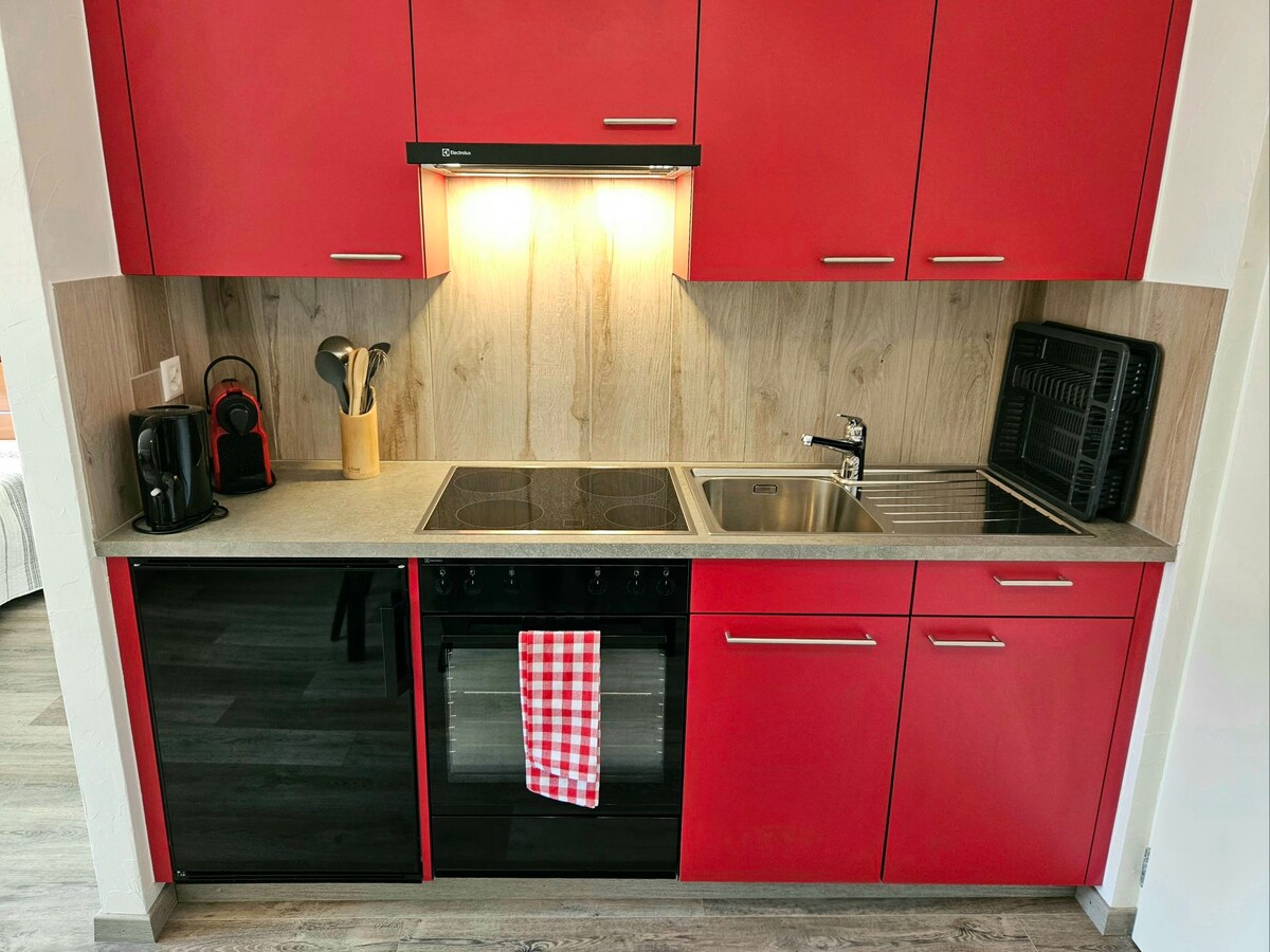 Koselig studio (21 kvadratmeter) i nærheten av sentrum i sjarmerende Crans-Montana, ti minutters spasertur til skibakkene, ved siden av Moubra-sjøen og overfor golfbanen (langrenn om vinteren). For opphold på syv dager eller mer tilbyr jeg frokost!