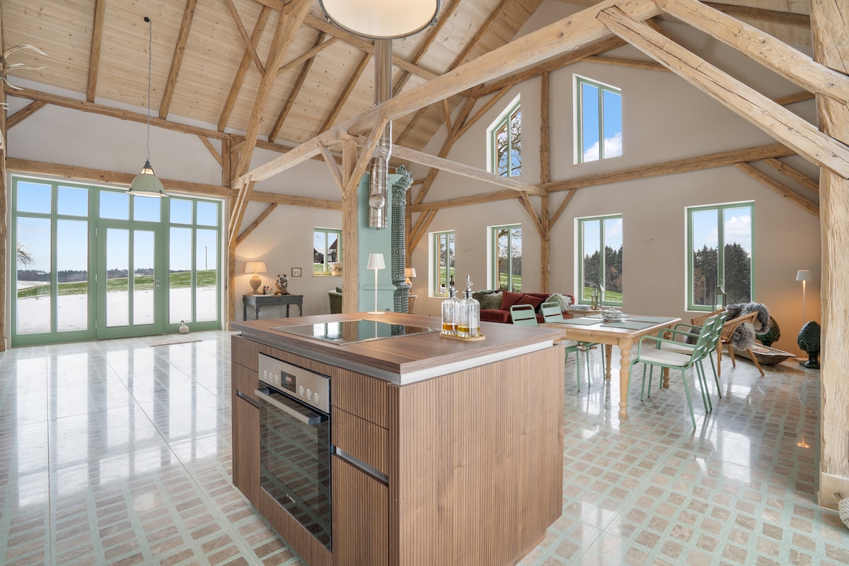 Stilig restaurert gammel låve på en fantastisk avsidesliggende beliggenhet, som tilbyr 120 kvm plass med panoramautsikten over landskapet, et galleri på 50 kvm med store vinduer, en infrarød hytte, dusjkabinett, badekar, luksuriøst designerkjøkken, terrazzo-marmorgulv med elektrisk gulvvarme, en historisk flislagt komfyr fra 1700 og en inngjerdet hage for så mange hunder du vil. En drøm bare 15 min fra Passau, 3 min fra motorveien og 10 min fra Donau. Kan bestilles fra november 2025