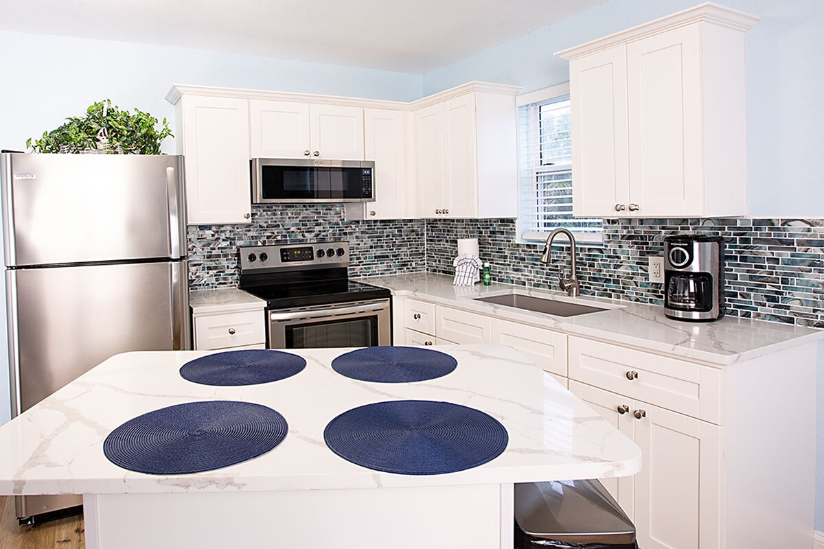 Prisen du ser er den endelige prisen. Det er ingen skjulte ekstra skatter! 🚶 Kort 10 minutters SPASERTUR til stranden 🅿️ Oppkjørselen har plass til to biler 🌐 Rask trådløst nettverk 📺 Smart TV ☕Kaffebrygger og Keurig med 14 kopper ❄️ Sentral klimaanlegg og varmeapparat 🍼 Barnestol, Pack 'n Play, servise for barn 🧺 Vaskemaskin og tørketrommel 🧻 Håndklær, hårføner, sjampo, balsam og dusjsåpe 👔 Strykejern og strykebrett 🐕 Fullt inngjerdet bakgård