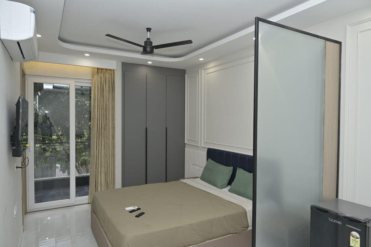 Premium 1BHK serviceleilighet i sektor 43, Gurgaon med klimaanlegg i stue og soverom, pluss et tekjøkken med induksjon, mikrobølgeovn og bestikk. I et flott område, gangavstand til Gold Souk Mall og Shalom Hills School, 2,2 km fra Millennium City Centre Metro og 2,1 km fra Fortis Hospital. Utenlandske gjester er velkomne. Tidlig innsjekking er avhengig av tilgjengelighet og koster 500 INR. Sen utsjekking koster også 500 INR, og det legges til 500 INR for hver tredje time deretter.