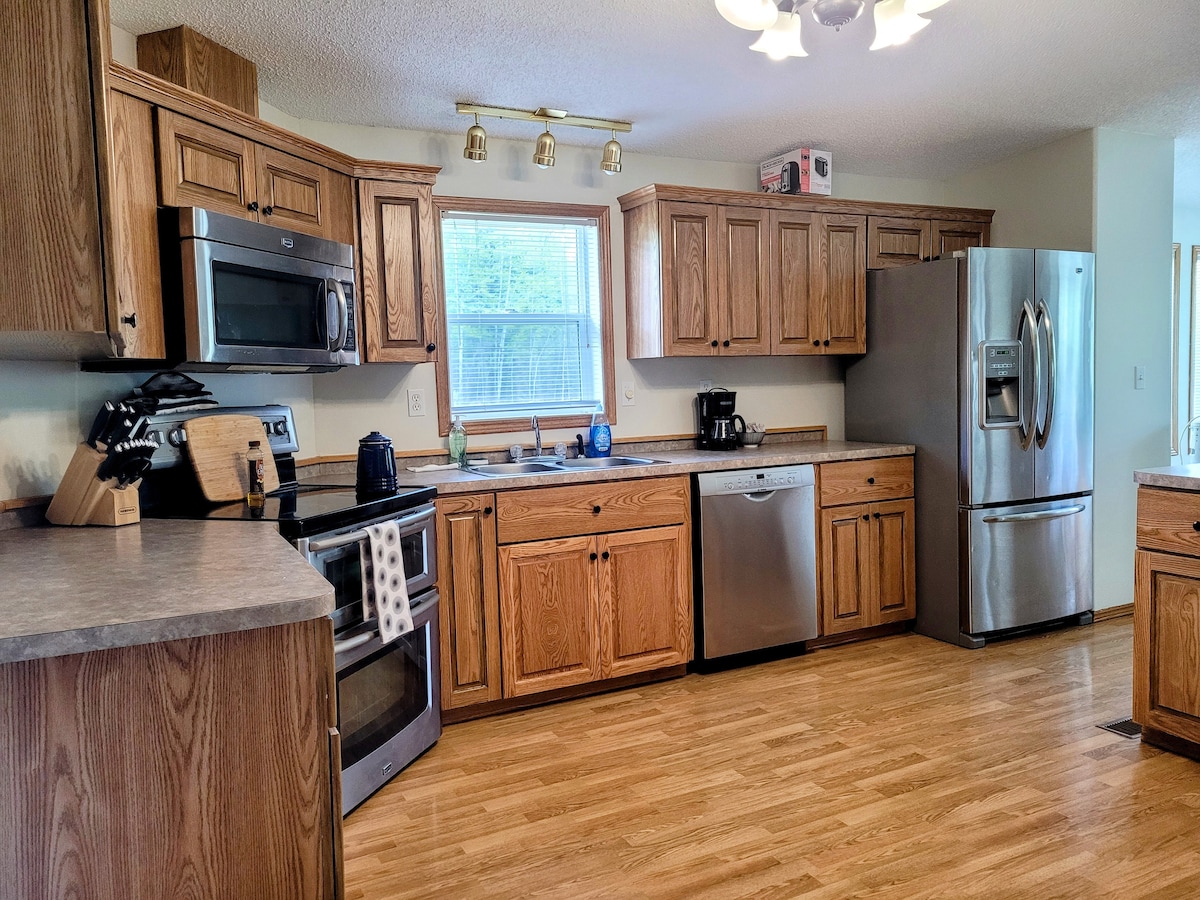 Beautiful 4 bedroom house, open concept. Large kitchen with all the appliances to prepare meals, dining room, living room, Master bedroom with 5 pc bath and one bedroom, main bath and laundry room on main floor. 2 bedrooms, bathroom and 2 futons in the loft. Large covered deck with barbecue kitchen and gazebos in back of house. Views of the lake from most windows. Walking distance to stores, park, beach. Boat launch available along with Paddle boat rentals. Private basement suite is occupied.