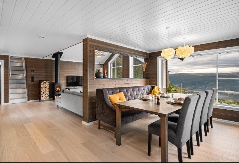Hytte ved fjorden med panoramautsikt