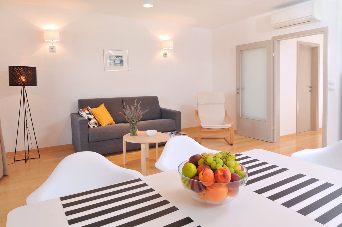 Føl adelen i en leilighet i en historisk østerriksk-ungarsk villa. Det er et moderne, luftkondisjonert sted med en koselig følelse takket være parkettgulv og muntre kunstverk. Del en flaske vin på en terrasse med utsikt over gamle furutrær. Vi var oppmerksomme på hver detalj for å lage et sted som føles som hjemme. Vårt ønske er at hver gjest skal ha en fantastisk ferie og reise hjem fornøyd. Leiligheten ligger i en historisk villa, omgitt av store sedertre og furutrær. .
