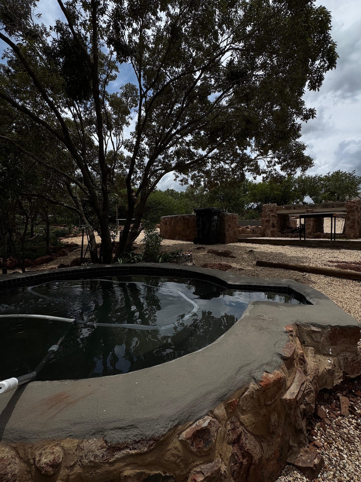 Livet på landet med alle fasilitetene du vil ha i byen. En sikker halmhytte bygget av stein. Ligger på en 21 hektar stor bushveld-gård. Mye fugleliv, impala, blisbukker og sjiraffer streifer rundt. Ett soverom med queensize-seng og eget bad. Åpen planløsning med fullt utstyrt kjøkken, spisestue og stue med queen size dobbeltseng og Dstv. Kul veranda blant trærne. Vakker terrassehage med (boma) grillområde. Under tak parkering. Basseng nylig lagt til.