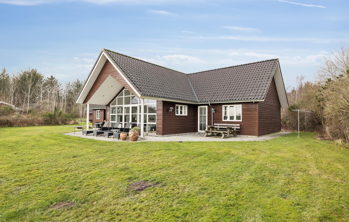 Ta med hele familien til dette fantastiske hjemmet med mye plass til moro og oppstyr. Nydelig og romslig «Energy saver Plus»-hytte med innendørs basseng og morsomt aktivitetsrom. Nydelig kjøkken med stor spiseplass og stue i åpen forbindelse og plass til å sitte og kose deg ved ved vedovnen. Stor terrasse med flott utsikt over Limfjorden. Kort gangavstand til stranden som er barne- og badevennlig. En flott ferie er garantert. Den leies kun ut til familier. Elektrisitet i henhold til måler: 4 DDK/KWH.