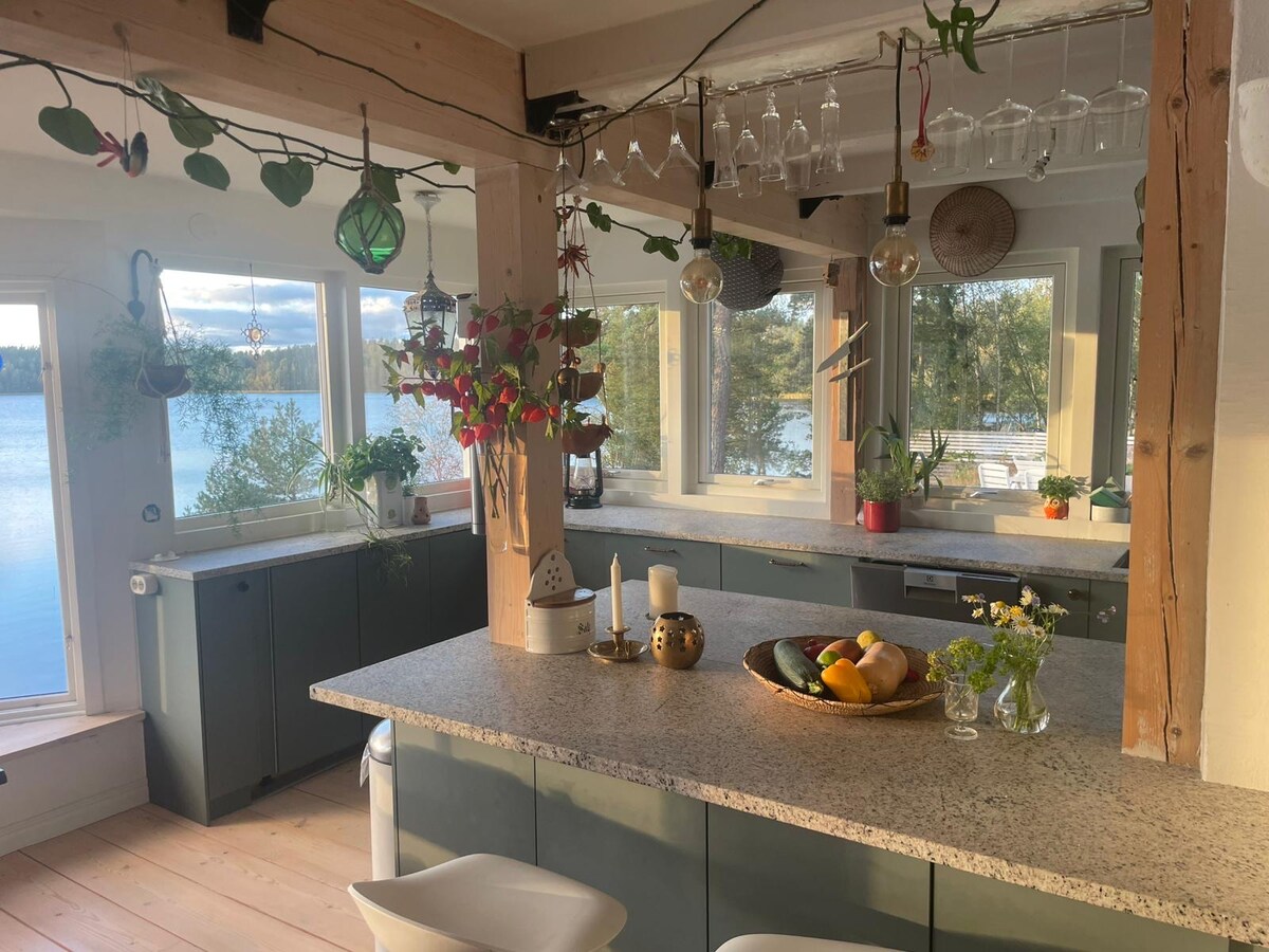 Nyt en 50 kvm husbåt med egen badstue og panoramautsikt over vannet. Svøm direkte fra soverommet. Du får en minneverdig opplevelse på grunn av utsikten, den vakre beliggenheten, hagen og bryggen med soldekket. Båten vår er egnet for par som liker å overraske eller feire partneren sin, eventyrere som ønsker å komme nær naturen og fortsatt være i nærheten av Stockholm. En kano er tilgjengelig om sommeren. Vi tilbyr også et ekstra spa og vedoppvarmet badstue om kvelden.