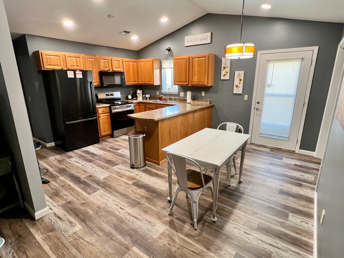 Rolig landlig opphold like ved I-70 med en lekeplass og ingen kjæledyrgebyr! Vi ønsker deg velkommen til vårt rehabiliterte gjestehus fra 1906 med moderne bekvemmeligheter på en 10 hektar stor gård. Dobbeltseng, dobbeltseng, sofa, futon på loftet. Nytt flislagt bad med regndusj og stang, kjøkkenkrok, kaffestasjon, plate-, CD- og kassettspiller, spill, barneseng, strykejern og strykebrett, smart-TV, bakdekke, gullfisk i tank for å mate, hester og storfe, og gårdskatter. KJÆLEDYR MÅ VÆRE I BURET NÅR DU IKKE ER TIL STEDE.