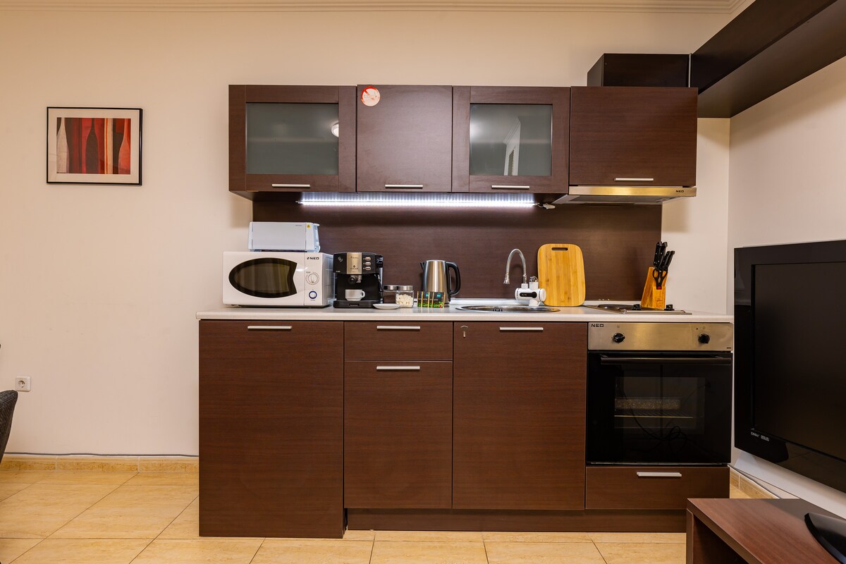 Opplev den perfekte blandingen av moderne eleganse og fjellsjelle i vår splitter nye luksusleilighet med ett soverom i Smolyan. Nyt fantastisk utsikt over Rhodopefjellene fra et stilig oppholdsrom med en myk queen size-seng, et fullt utstyrt kjøkken og en stor privat balkong. Med høyhastighets trådløst nettverk, sentralvarme og gratis parkering er dette tilfluktsstedet ideelt for par eller alenereisende. Ikke langt fra lokale restauranter og stier, er det din perfekte fjellferie.