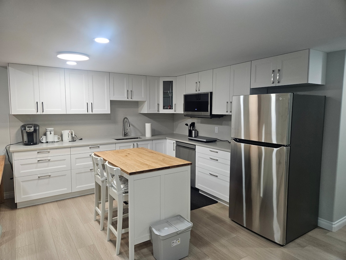 Len deg tilbake og slapp av på dette rolige, elegante stedet. Ha denne designer-eide gjesteleiligheten i andre etasje helt for deg selv. Helt ny med fullt kjøkken og luksuriøs innredning og fasiliteter. Nyt varme i gulvet om vinteren og klimaanlegg om sommeren. Gratis trådløst nettverk og to TV-er med kabel-TV, inkludert Amazon Prime og Crave. Det er en kodeaktivert inngangslås og en parkeringsplass i oppkjørselen. Godt opplyst med sikkerhetskameraer og en privat gårdsplassinngang til eiendommen. Eieren bor ved siden av.
