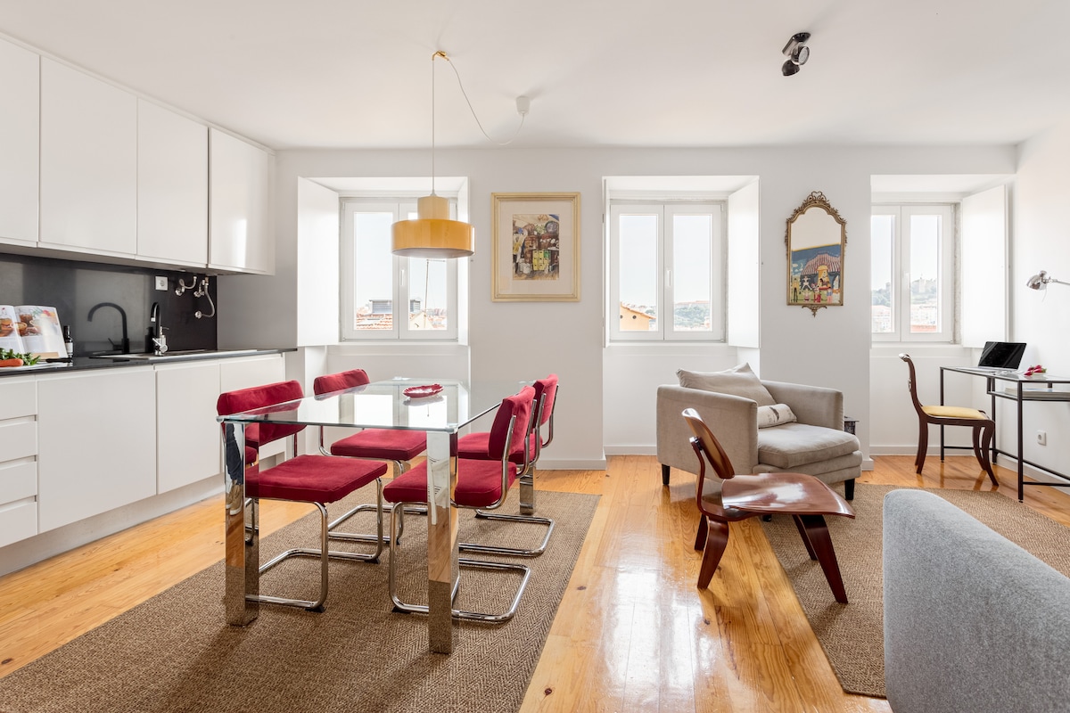En stilig takleilighet med ett soverom, en privat terrasse og fantastisk utsikt over São Jorge slott og elven Tajo. Beliggende i hjertet av Lisboa, i Marques de Pombal, i nærheten av den symbolske Eduardo VII-parken og Avenida da Liberdade. ⚠️VÆR OPPMERKSOM PÅ at det er byggearbeid ved siden av, og det kan være bråkete på dagtid.** Takterrassen er tilgjengelig via en utendørs spiraltrapp. På grunn av trappene må du være oppmerksom på at denne leiligheten ikke er egnet for personer med nedsatt mobilitet.