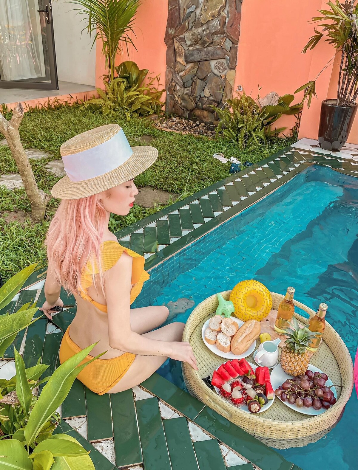 Rest and relax in the peaceful, poetic space of LIME House on the shore of Phu Nghia Lake, Soc Son, Hanoi. A duplex wooden house with large glass panels filled with light, hidden in a garden filled with chirping birds. In front of the house is a small wooden swimming pool, connected to a large porch, a dining table, a BBQ kitchen under a purple flower trellis. A long green lawn, next to a row of dark pine trees. 20 minutes from airport 60 minutes to Center Hanoi City.