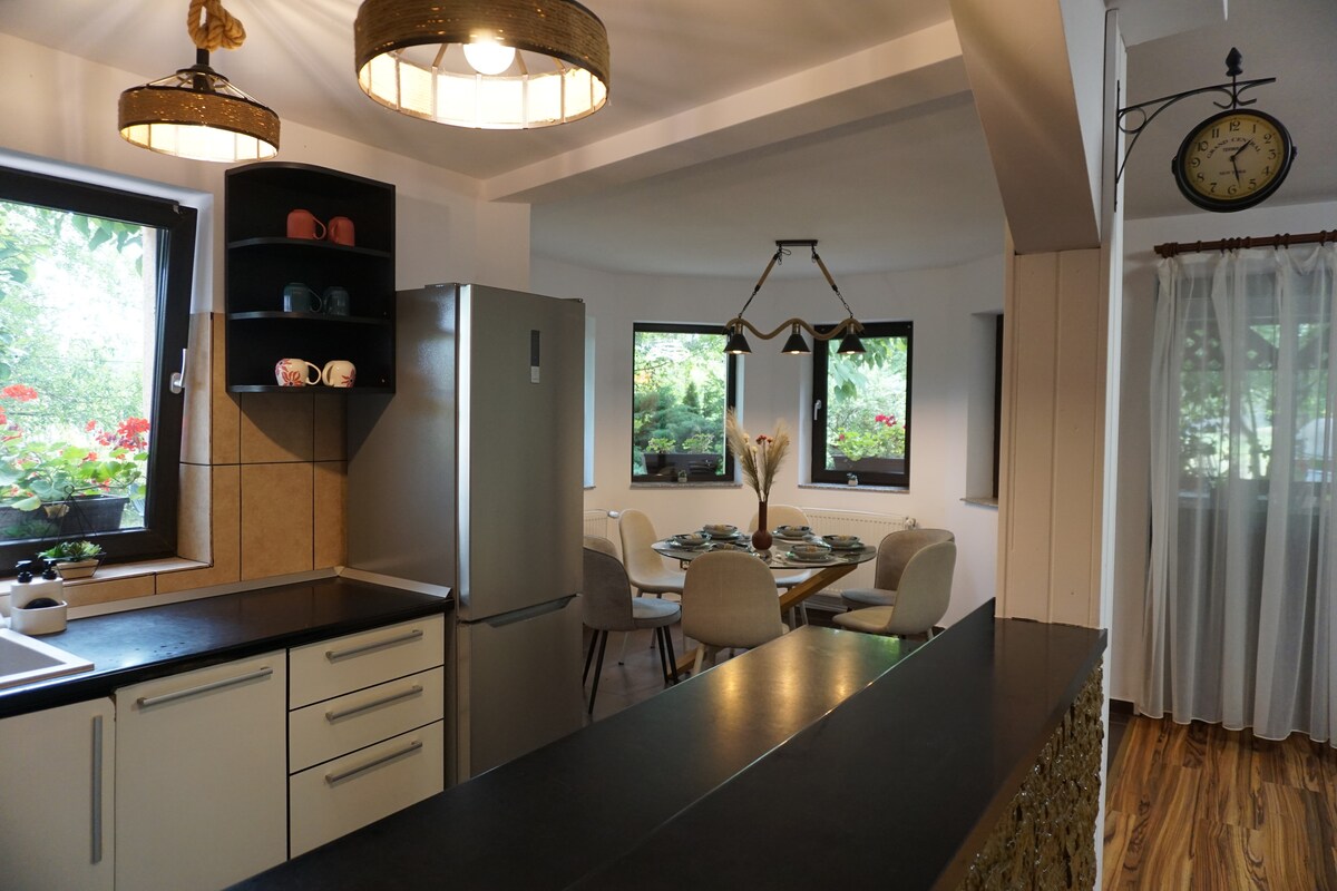 Villaen vår ligger i hjertet av Transilvania, i nærheten av Deva-festningen, og ønsker deg velkommen med roen i naturen og skyggen av trær. Perfekt for overnatting og private arrangementer, her kan du nyte moderne komfort og fullstendig avslapning, vekk fra byens mas. Eiendommens fasiliteter inkluderer en avslappende hage, en fontene, en grillplass, en overbygd terrasse og en bålplass og en lekeplass. Stedet har en stor spisestue, kjøkken, 4 soverom og 2 bad.