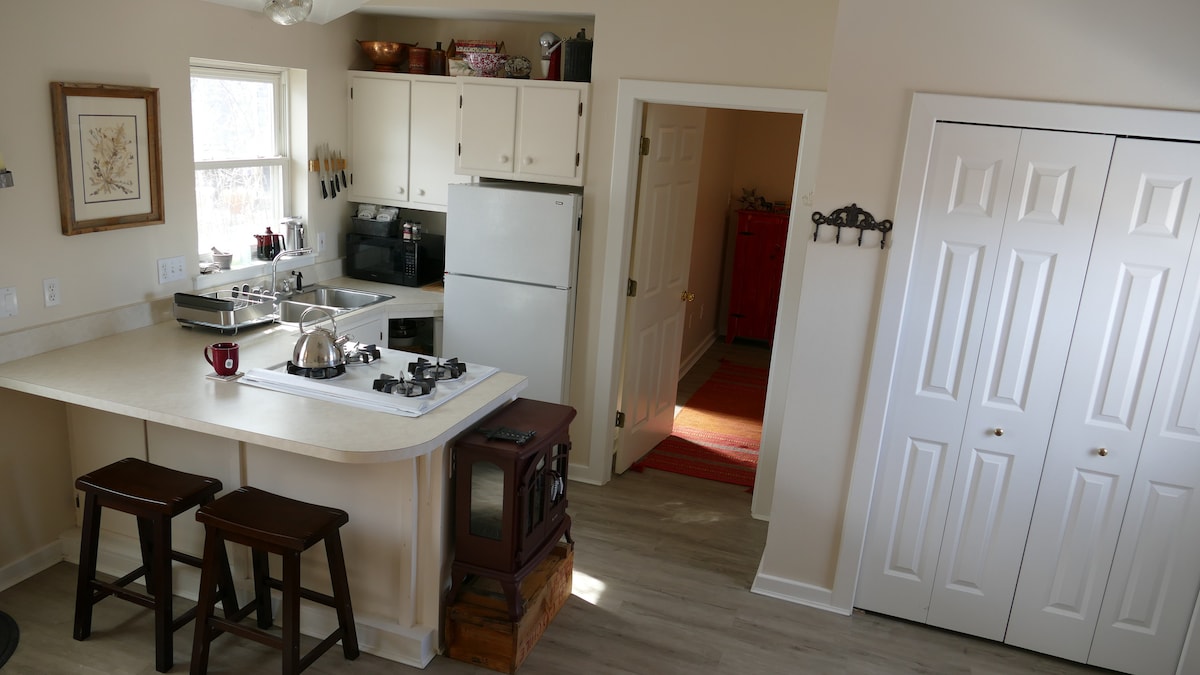 Elderberrys suite er en komfortabel, koselig ettromsleilighet knyttet til vår klassiske gård fra 1908 og ligger på en 4 hektar stor urtefarm, urteutdanningssenter i den unike kreative byen Paonia. Hvis du elsker natur, urter, frukthager eller vingårder, vil du føle deg som hjemme her. Minnesota-bekken renner gjennom gården. Vi ligger rett i utkanten av byen, ved siden av Juniper & Sage-åsene med utsikt over vakre snødekte fjell . Og ... vi har greit fibernett for Zooming!