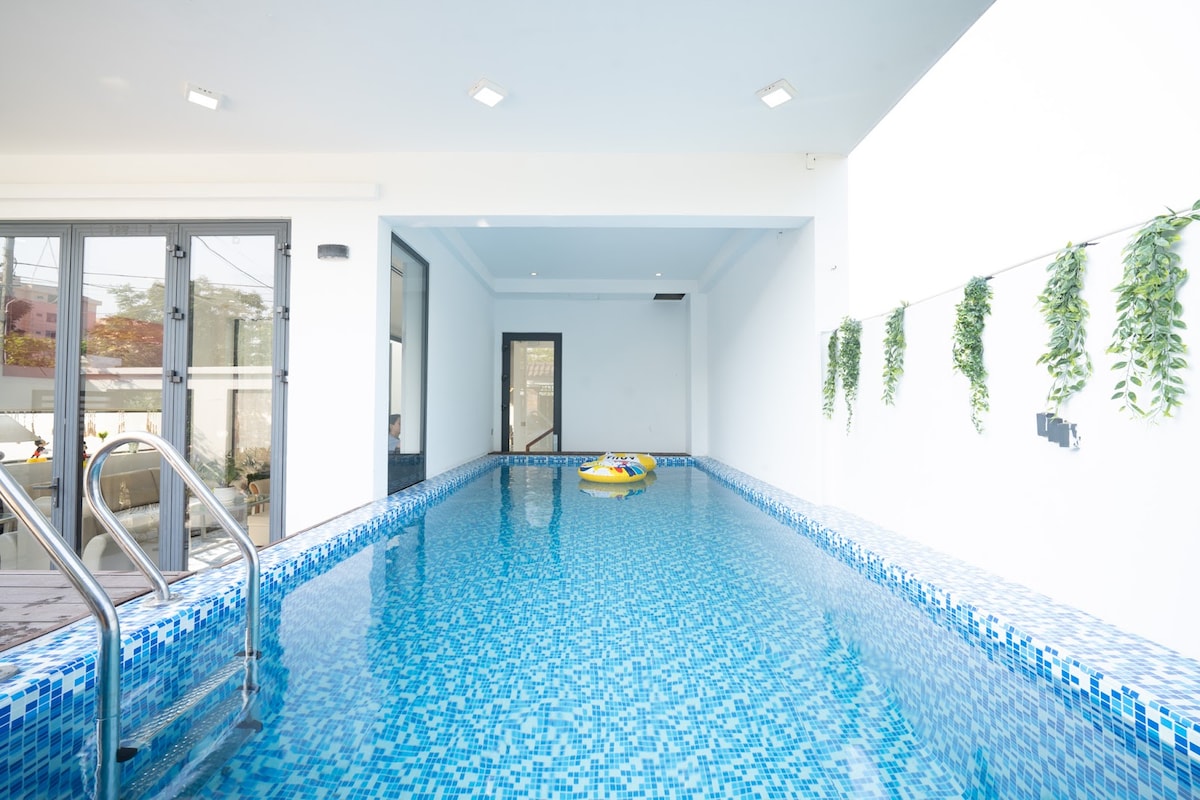 Sang Villa, 155 Nguyen Dinh Hoan, seks soverom i Da Nang sentrum, eget privat innendørs svømmebasseng, utegrillområde, biljardbord for underholdning og en moderne, romslig stue. Hvert rom har eget toalett, luksuriøs design og åpen planløsning. Nær Thuan Phuoc-broen og sentrum, ideelt for vennegjenger, familieferier og fester. Virtuell innsjekking. Nyt ferien fullt ut med alle fasiliteter, privatliv og komfort.