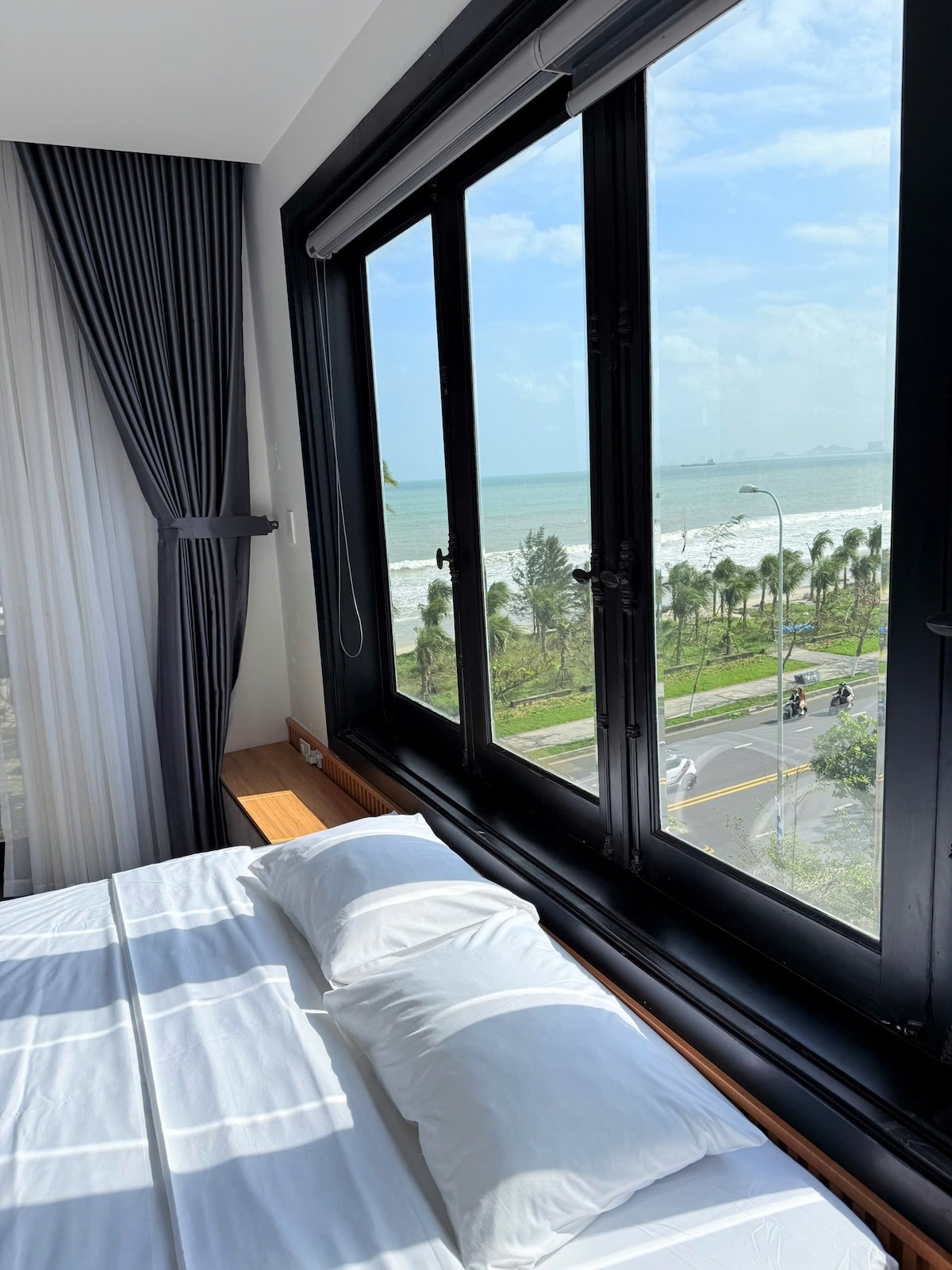 Velkommen til leiligheten min ved stranden, et koselig tilfluktssted med fantastisk utsikt over havet og den berømte Da Nang-fyrverkerifestivallen (to utsikter). Bare 60 meter fra stranden kan du nyte de beroligende lydene av bølgene og det fantastiske landskapet fra den komfortable balkongen. Denne fredelige ferien er perfekt for å slappe av etter en dag med utforskning. Med en romslig utforming og moderne fasiliteter er du her for en romantisk ferie. Leiligheten lover en rolig og pittoresk opplevelse ved havet.