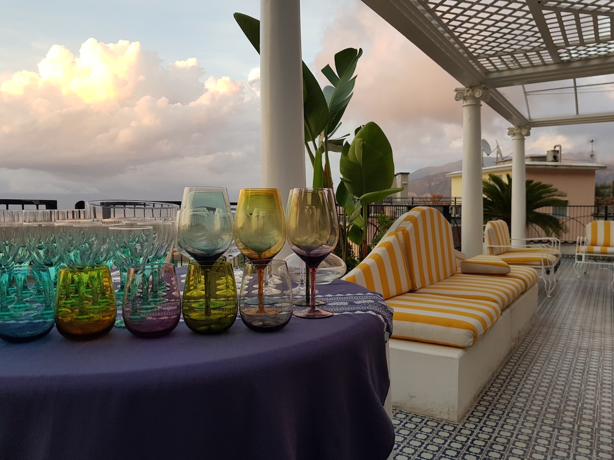 Fantastiske solnedganger over Sorrentobukten fra eiendommens balkong med utsikt over havet fra den historiske Villa fra 1800-tallet. Sjarmerende, elegant og velutstyrt feriehus i eksklusiv eiendom. Et dobbeltsoverom, en stue med en veldig komfortabel dobbeltseng, to bad, kjøkkenkrok. Den har steinvegger, høyt tak, antikke møbler, sammen med moderne funksjoner som infrarød badstue, kromoterapidusj, raskt trådløst nettverk. Privat terrasse. Gratis parkering. CUSR 15063080EXT1055