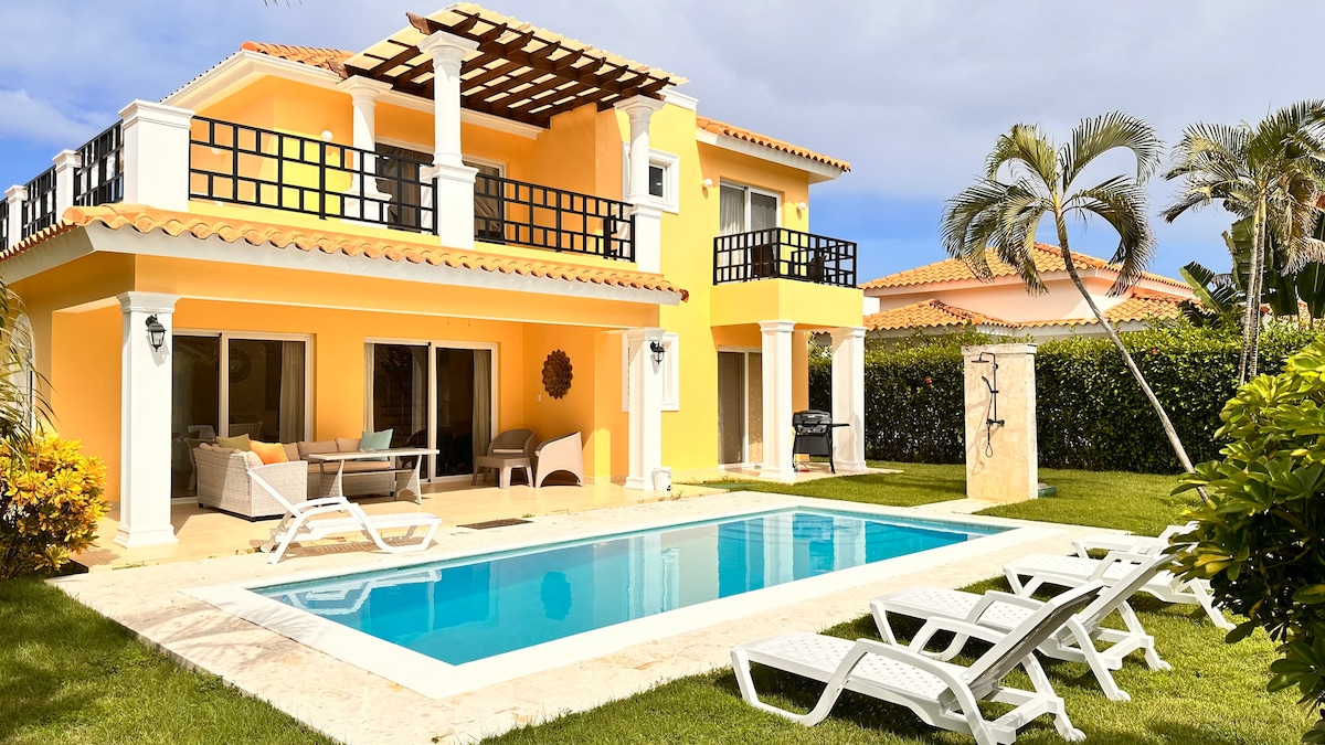 Slapp av i denne villaen med fire soverom, privat basseng og tropisk hage. Den ligger i Casa Linda-komplekset, og tilbyr privatliv, komfort og tilgang til flere aktiviteter. Hvert rom har eget bad. Perfekt for familier eller grupper. Gratis transport til stranden og sentrum. Strøm er inkludert i opptil 7 dager, så belastes det etter forbruk.