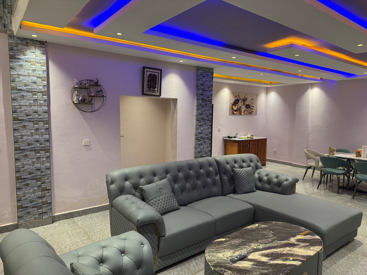 Elegant og romslig overnattingssted, ideelt for familieopphold. Denne dupleksen har fire soverom med klimaanlegg, to stuer, fem bad og fem balkonger, og tilbyr komfort og privatliv. Boligen ligger på T8 og har en vakt og en hushjelp. Overnattingsstedet er utstyrt med kjøkkenutstyr. Merk: trådløst nettverk (50 000 GNF påfyll), vaskemaskin og gass for matlaging er leietakerens ansvar.