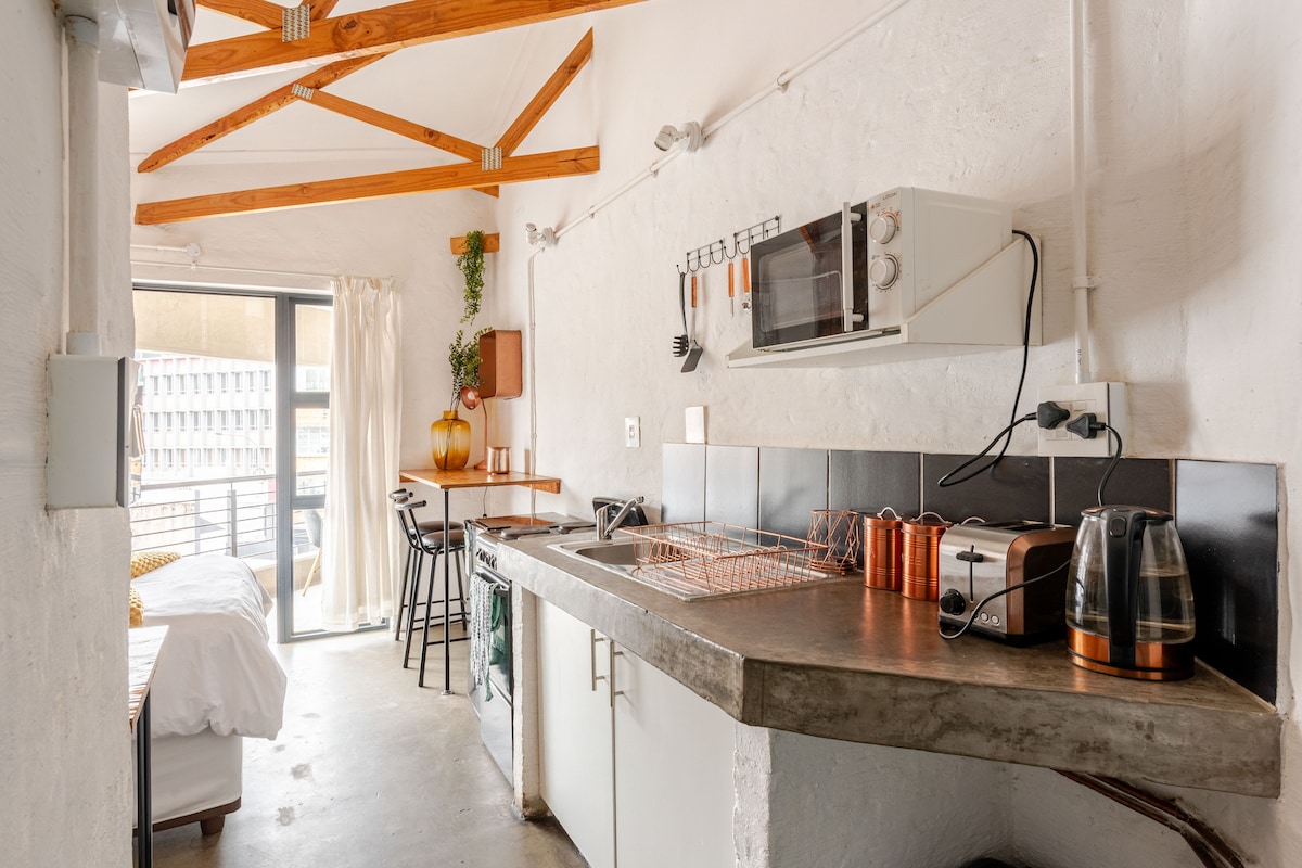 Denne nyrenoverte, stilige studioleiligheten ligger i den superpraktiske og trygge Gardens Shopping Centre-leilighetsblokken, og har alt du trenger bokstavelig talt rett utenfor døren for å nyte Cape Town og omgivelsene. Stedet ligger i 12. etasje og har en fantastisk utsikt over det ikoniske Table Mountain. Det er perfekt for å slappe av etter en dag med sightseeing eller for å jobbe eksternt med rask og pålitelig trådløst nettverk. Gratis sikker parkering under tak kan avtales med ubegrenset betalt parkering for gjester.