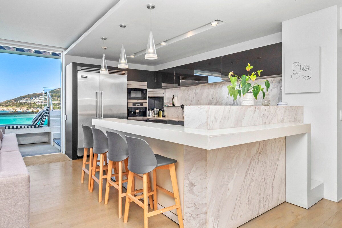 Romslig Camps Bay-leilighet hvor fantastisk havutsikt er lik den fantastiske stilen inne! Nyt det vi har å tilby, og slapp av på terrassen i den gylne timen hver dag. Cape Towns mest utsøkte forstad med de beste strendene, restaurantene og barene, på baksiden av Taffelberget og sentrum – alle aktiviteter innen fem minutter med bil, til fots, på buss og Uber-ruter. Det ideelle stedet for å balansere arbeid, liv og lek!