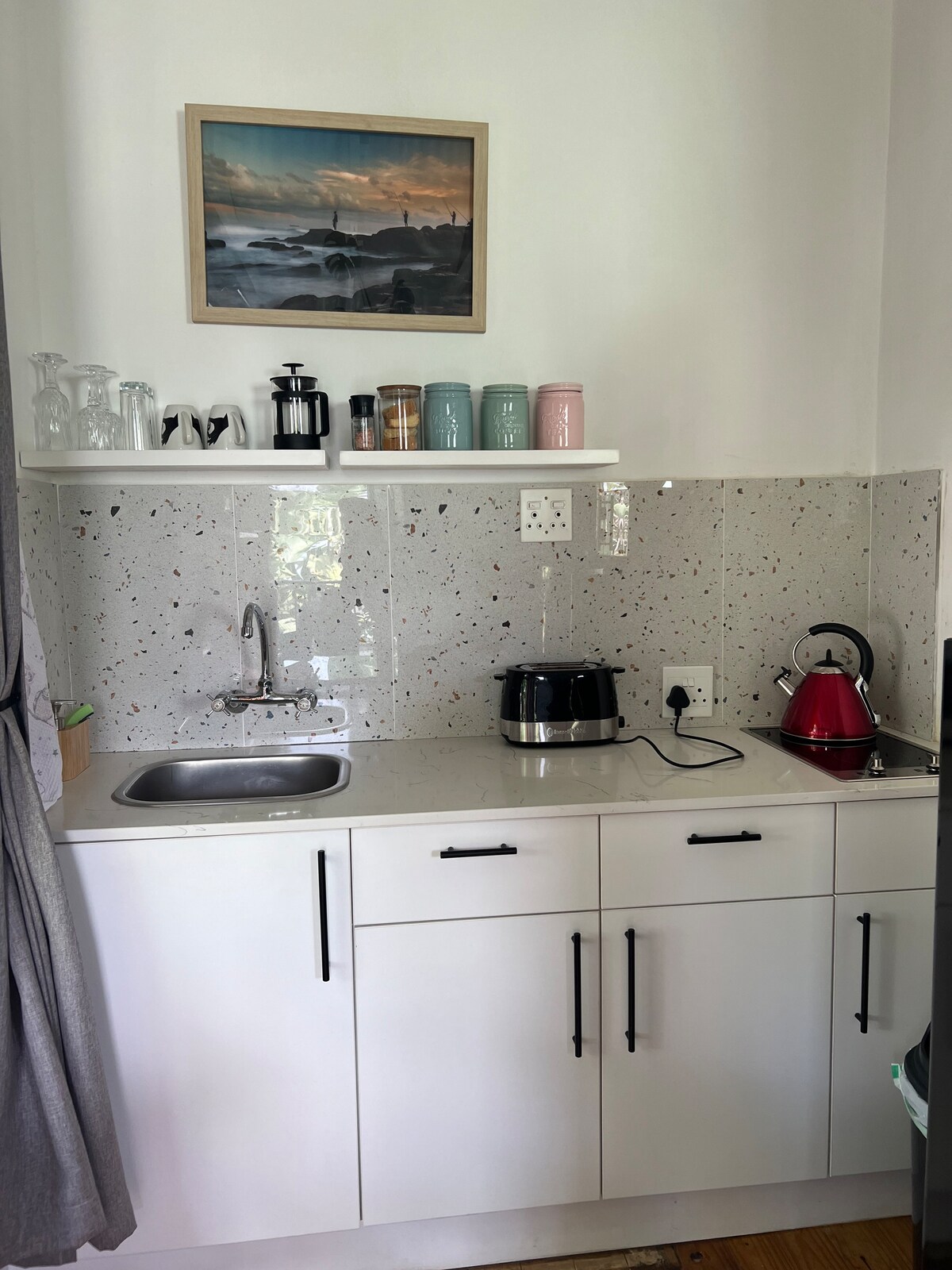 En romslig studioleilighet i loftsstil med åpen planløsning, med plass til to gjester. Perfekt for et par eller en enslig reisende. Det ligger fredelig tilbaketrukket fra hovedveien og innenfor gangavstand til stranden. Det er det perfekte stedet for en ferie, surfing eller forretningsopphold. Separat inngang til en uteplass med utsikt rett over Lowerpoint. Nyt spektakulære soloppganger mens du nyter en morgenkopp, eller nyt en braai på terrassen med kveldsdrinker, mens du ser på bølger og delfiner.