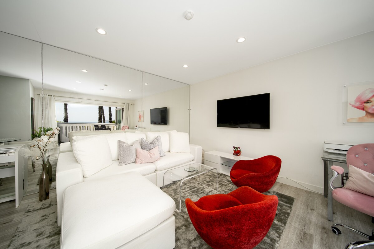 LIVE_WORK_BEACH_SURF Steps to Sand – dette er faktisk mitt primære hjem, ikke bare et AIRBNB-utleiested. Det er virkelig et fantastisk sted å bo og bo og jobbe. Flere forskjellige salonger og arbeidsområder for enten å skille seg fra hverandre eller samarbeide kollektivt. Ingen klimaanlegg. Takvifter og havbris i overflod. Primær suite: høyt tak, 42" TV. Gjesterom: queensize-seng, skrivebord, badekar. Moderne, tilpassede møbler overalt – kontor og terrasse med flott utsikt.