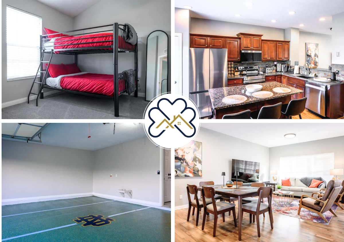 Tilbake på utleiemarkedet (profesjonelle bilder kommer snart)! Irish Belles er ditt Game Day Family Retreat — et fullstendig renovert rekkehus med 3 soverom/3,5 bad overfor Notre Dame og Saint Mary's. Hvert soverom har eget bad. 10 sengeplasser med to stuer, komplett kjøkken, Roku Smart-TV, raskt trådløst nettverk og garasje. Bakgate-klar med 65"smart-TV, stoler og stadionutstyr. Gå til stadion eller ta gratis skyttelbuss fra Saint Mary's. Perfekt for irske fans, alumnibesøk og familieturer!