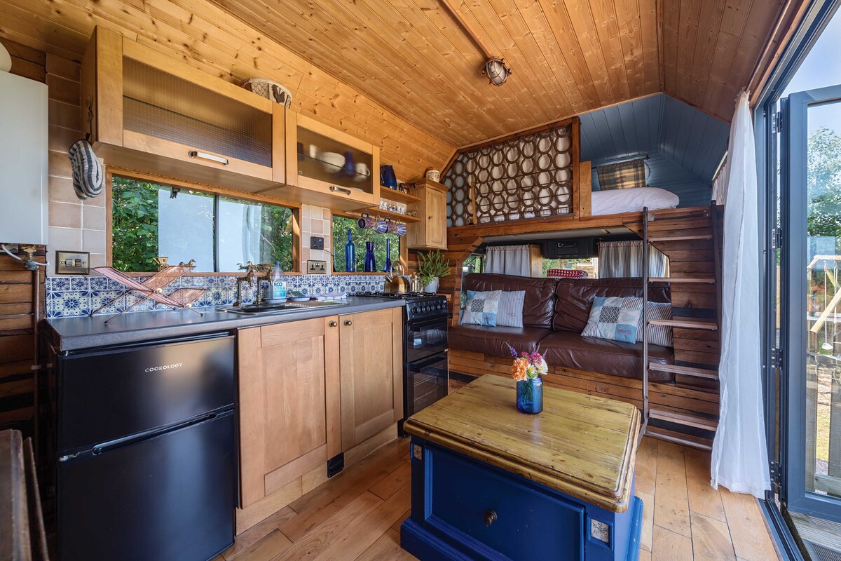 Ruby Rose er den perfekte glampingferien utenfor strømnettet – en unik, fullt utstyrt, ombygd hestetransport på sin egen åker på en liten gård i nærheten av Totnes. Selv om den er helt utenfor strømnettet, har den alle hjemmets bekvemmeligheter, inkludert trådløst nettverk, TV, gasskomfyr, kjøleskap/fryser, varmluftsoppvarming og moderne komposttoalett og dusj. Dekkområder utenfor stuen og soverommet gir fantastisk utsikt over landskapet. Du har hele området for deg selv, med spiseplass utendørs, grill, husker, bordtennis og egne høner!