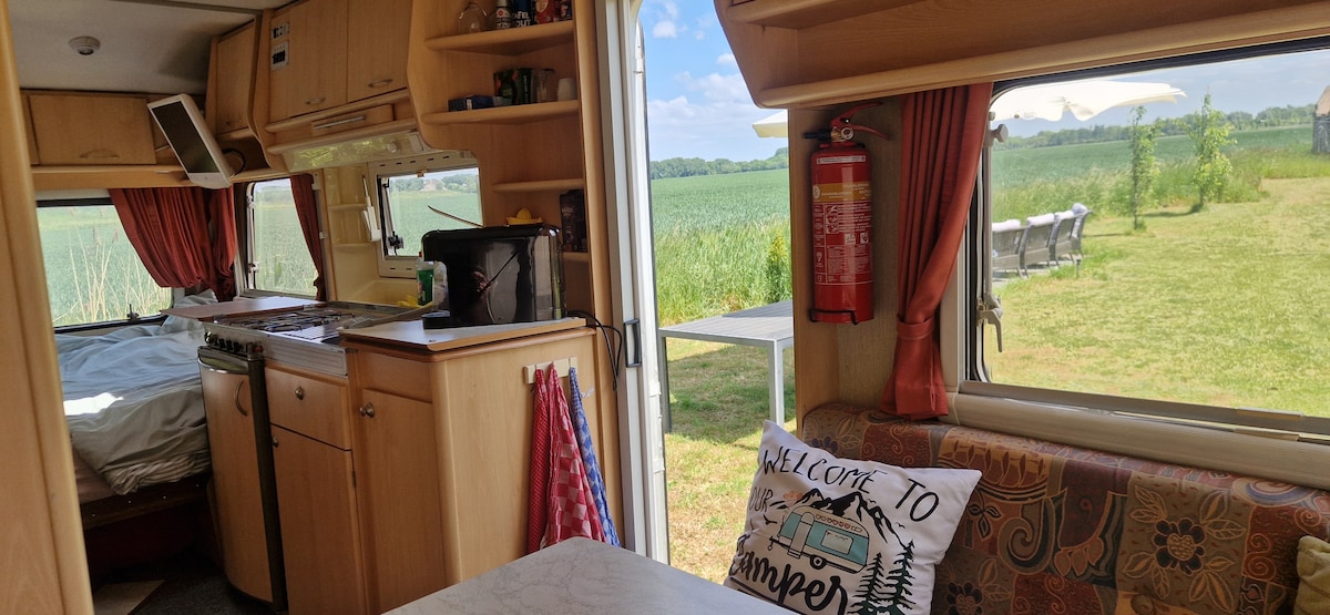 Denne campingvognen i retro-hollandsk stil for 4 personer har en vakker utsikt. Ved siden av står den samme campingvognen, men mindre. Denne er omgjort til et soverom med en stor dobbeltseng. Merk at det IKKE er wifi. Det går tamme griser rundt i hagen. Denne retro-campingvognen i nederlandsk stil for 4 personer har en fin fri utsikt. (INGEN Wifi!) Ved siden av den er den samme campingvognen, men mindre. Dette rommet er omgjort til et soverom med en veldig stor dobbeltseng. Vi har to tamme griser som går fritt i hagen