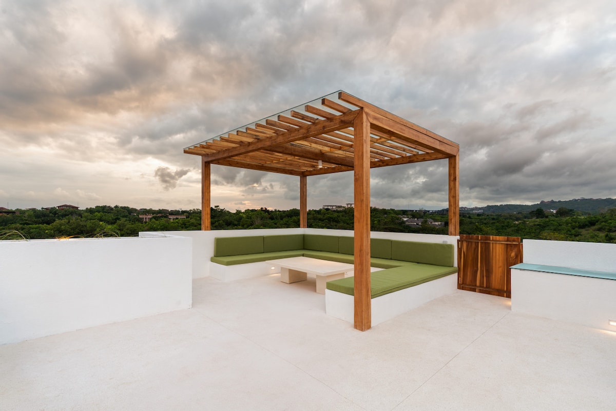 Unwind at our brand new tropical modern villa in the heart of Bingin. 🏝️ 5-8 minutes to Bingin & Dreamland Beach 🛌 Two King beds with premium mattresses, linens, ensuite bathrooms, rainfall showers & blackout curtains 🌅 Rooftop Sauna, Plunge Pools & Loungers with breathtaking sunset views over Uluwatu 🌴 Private pools surrounded by lush tropical greenery ❄️ AC enclosed living spaces, with sliding doors to let in the ocean breeze 🍽️ Fully equipped kitchen, board games & charming dining nooks