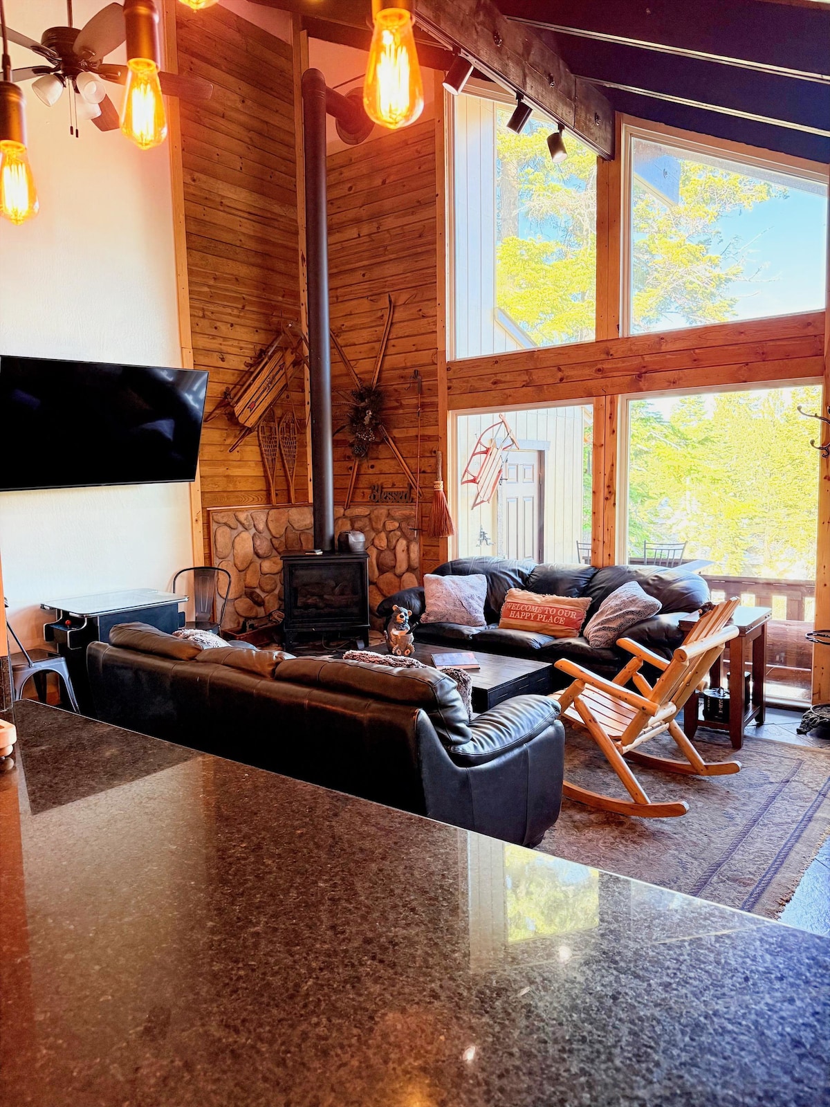 Basecampen vår ved Lake Tahoe ligger bortgjemt i National Forest Land og ideelt plassert mellom flere skianlegg og innsjøen. Omgitt av høye furuer, skog og fjell, kan du nyte fotturer, gå med truger og gå til Upper Truckee River fra bakdøren. Godt optimalisert med biljardbord, peiser, PS5, utstyrt kjøkken, stort spisebord og komfortable møbler. Med syv senger, inkludert tre kingsize-senger og et køyerom, kan vi ta imot åtte gjester pluss ekstra barn som er fem og yngre.