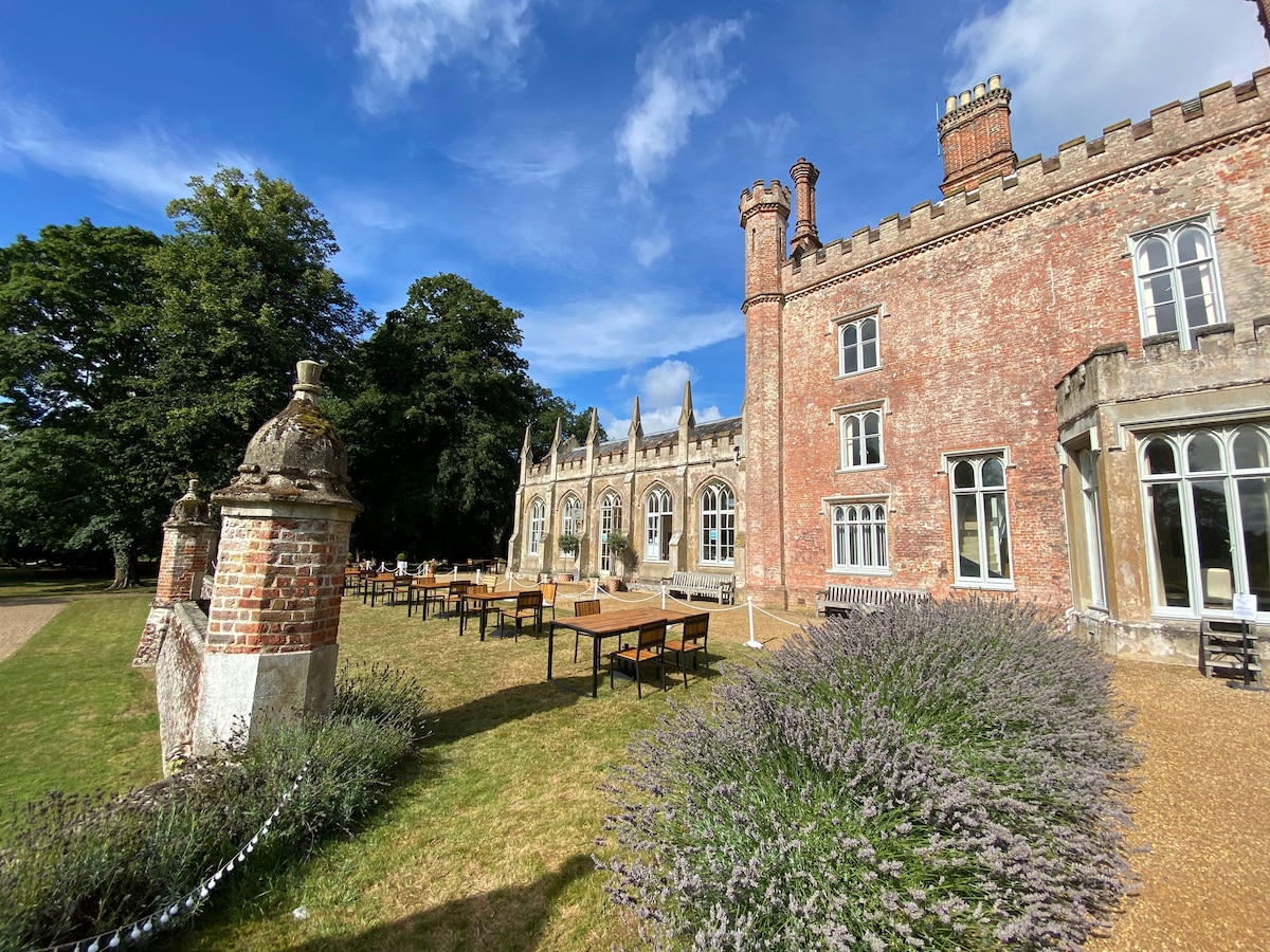 Peacock is a beautiful Shepherd Hut hidden in the quiet woods of historic Ketteringham Hall. A superb place to explore nearby Norwich & Norfolk. The Broads & Norfolk coast are close. The hut has a king size bed, wood burning stove and ensuite bathroom with shower. There is a lovely area surrounded by trees complete with picnic table, BBQ and firepit for 'relaxing. There are 38 acres of grounds to explore plus a large lake .The Orangery Tea Room is on site serving breakfast & teas.