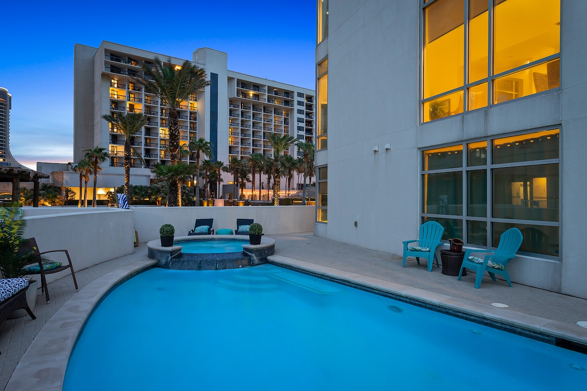 Vil du unnslippe hverdagens slit? Vi gleder oss til å se deg, vennene dine og familien slappe av med stil på vårt moderne feriested med innsjekking uten vert ved Laguna Madre Bay! – Utsikt over bukten fra stuen, hovedsoverommet og juniorsuitene hver morgen. – Terrasse og kullgrill for grilling. – Felles fasiliteter: glitrende basseng, beroligende boblebad og en strandpromenade som strekker seg ut over bukten for fiske. – To parkeringsplasser på eiendommen og raskt trådløst nettverk. – Strand, restauranter og mer ligger en kort kjøretur unna. Den perfekte utflukten starter her!
