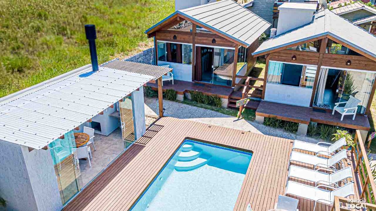 Bungalow Estrela ligger på Ribanceira-stranden, på toppen av åsen med en privilegert utsikt over havet. Fantastisk! Et rolig og koselig miljø midt i naturen med total privatliv og sikkerhet. Ideelt for par. Bli kjent med stedet vårt, som har et dekk med SPA, alle nødvendige apparater og utstyr, TV, klimaanlegg, peis, vann med gassoppvarming og 500 mb wifi.
