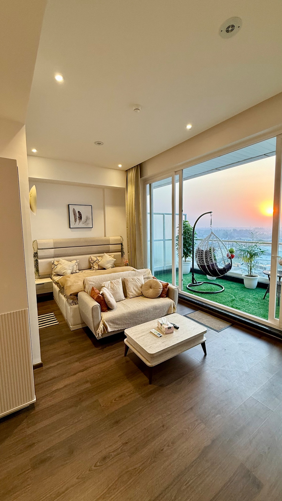 A cozy, modern Studio at Satya The Hive, Dwarka Expressway, featuring a sleek TV unit, elegant desk setup, soft lighting & elegnat décor. The space includes greenery, decorative accents, and warm beige tones that create a soothing, functional ambience. The balcony includes a cozy swing perfect for morning coffee or relaxing evening, offering a serene, modern retreat.With its inviting balcony swing, lush greenery & refined interiors, this space is more than just studio, it’s lifestyle experience.
