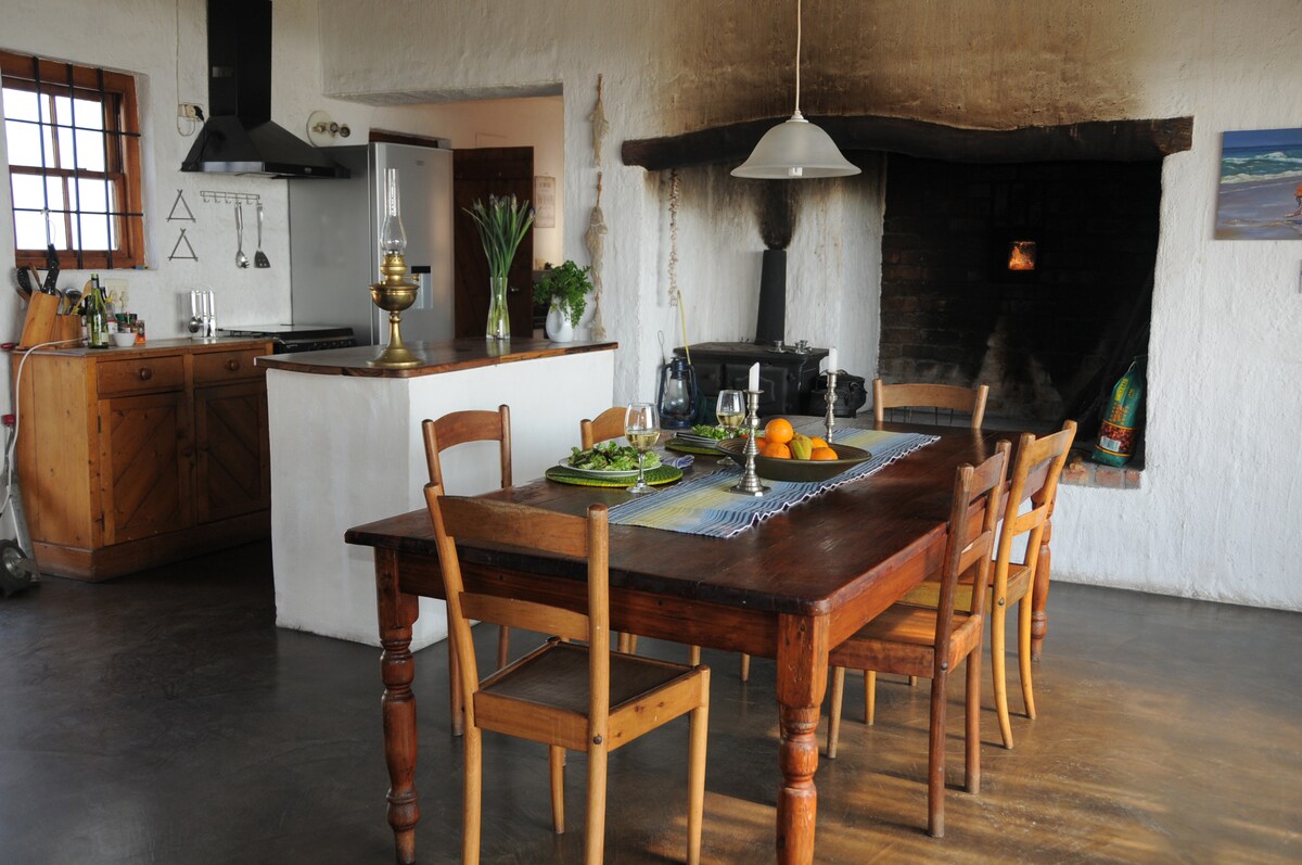 På stranden! Die Vissershuisie er en romantisk hytte med tre soverom bygd i tradisjonell vestkyststil. Hvert av soverommene har eget bad og en queen size-seng. Prisene våre belastes PER PERSON/per rom. Det er en stor stue med full DSTV og en vedovn. Vær oppmerksom på at du bare kan bruke ved (ikke kull ) i komfyren. Ta med eget ved. Stabling dører åpner ut mot en terrasse med en braai (grill) og nydelig havutsikt - ideelt for uteservering.