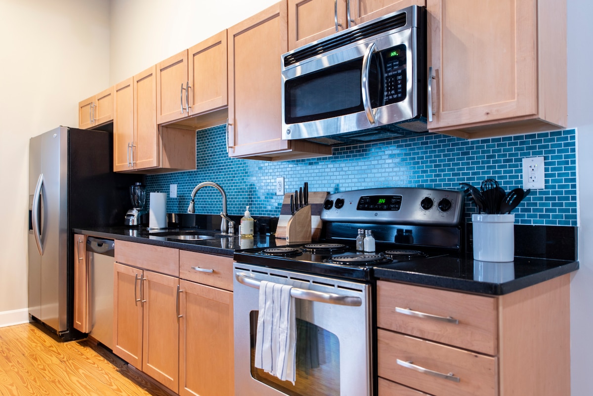 Helt ny loftsleilighet i andre etasje med gratis tildekket parkeringsplass under, en stor terrasse og mulighet for utendørs bespisning. Direkte over Maxwell St. fra Rupp Arenas parkeringsplass – du kommer ikke nærmere! Denne bygningen med én enhet ble bygget på stylter for å maksimere uteplass og utsikt over sentrum. Din perfekte oase midt i handlingen inkluderer et fullt kjøkken, vaskerom, bad, stue og Smart-TV. Kom på konsert eller bli en stund, du har alt du trenger under turen din til Lexington!