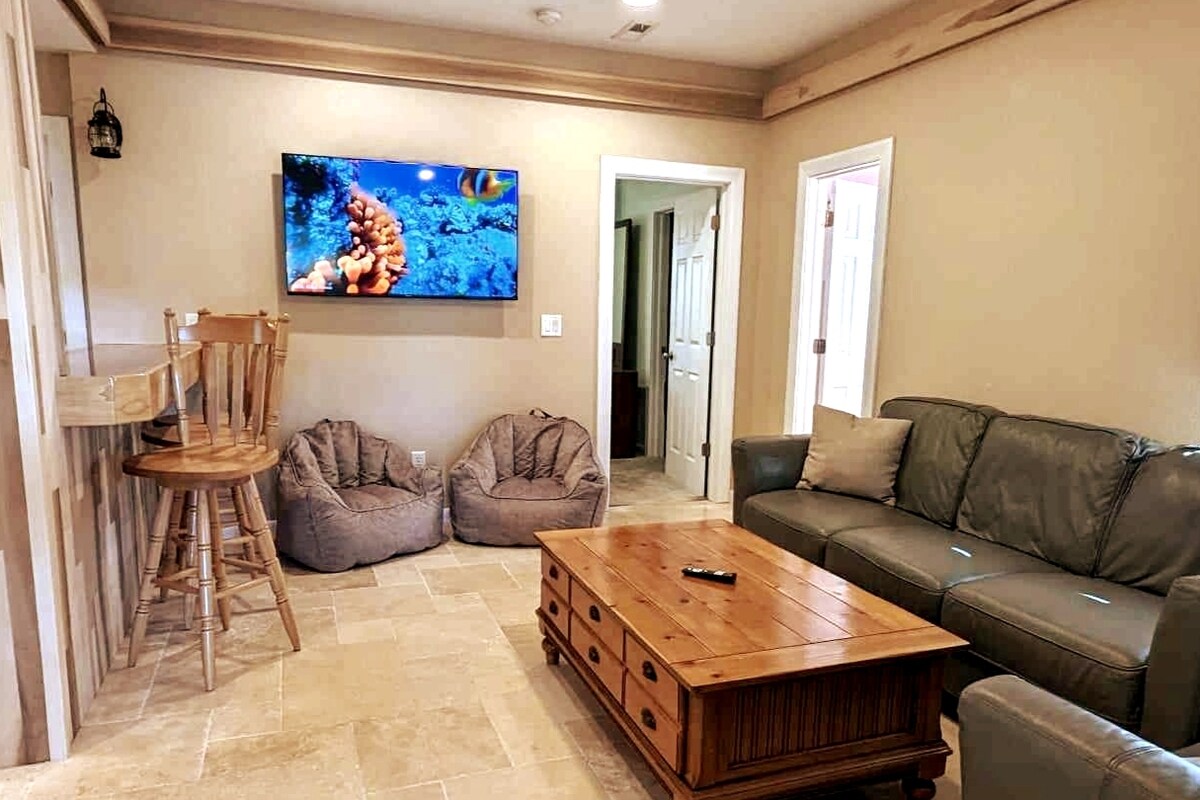 Slapp av i en privat suite som ligger i et vakkert skogsområde, et rolig og skyggefullt sted å ta av deg flippfloppene og slappe av etter en travel dag. Bare en kort avstand fra stranden, golfbane, restauranter og shopping. Denne suiten i andre etasje har egen inngang, privat terrasse, stue med sofa, 47 tommers TV, minikjøleskap, mikrobølgeovn og Keurig, to soverom med én kingsize-seng og én queensize-seng, og ett fullt bad. Hage, utedusj og bålplass er tilgjengelig for bruk.