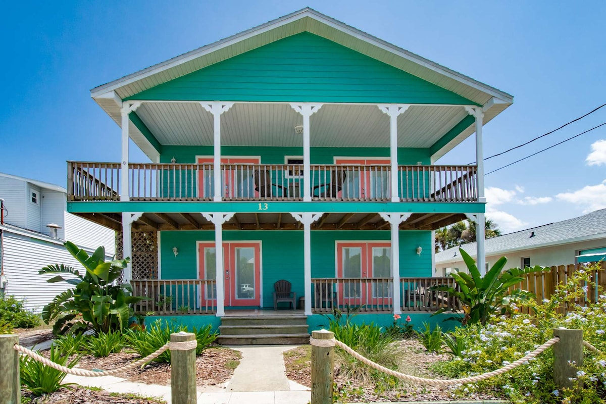 Beliggenhet, beliggenhet, beliggenhet! Lys strandleilighet i andre etasje, nylig renovert, to kvartaler til den vakre sanden i St. Augustine Beach! Tilbring dagene på stranden og kveldene med å utforske den historiske sentrum. Leiligheten har to soverom – ett med kingsize-seng og to med enkeltsenger, nytt bad, kjøkken, spisestue og stue med åpen planløsning, balkong, utedusj, parkering, Roku-TV og trådløst nettverk. Lytt til bølgene fra terrassen om kvelden! Vertskapet er en lokal familie som legger mye kjærlighet i sitt første hjem.