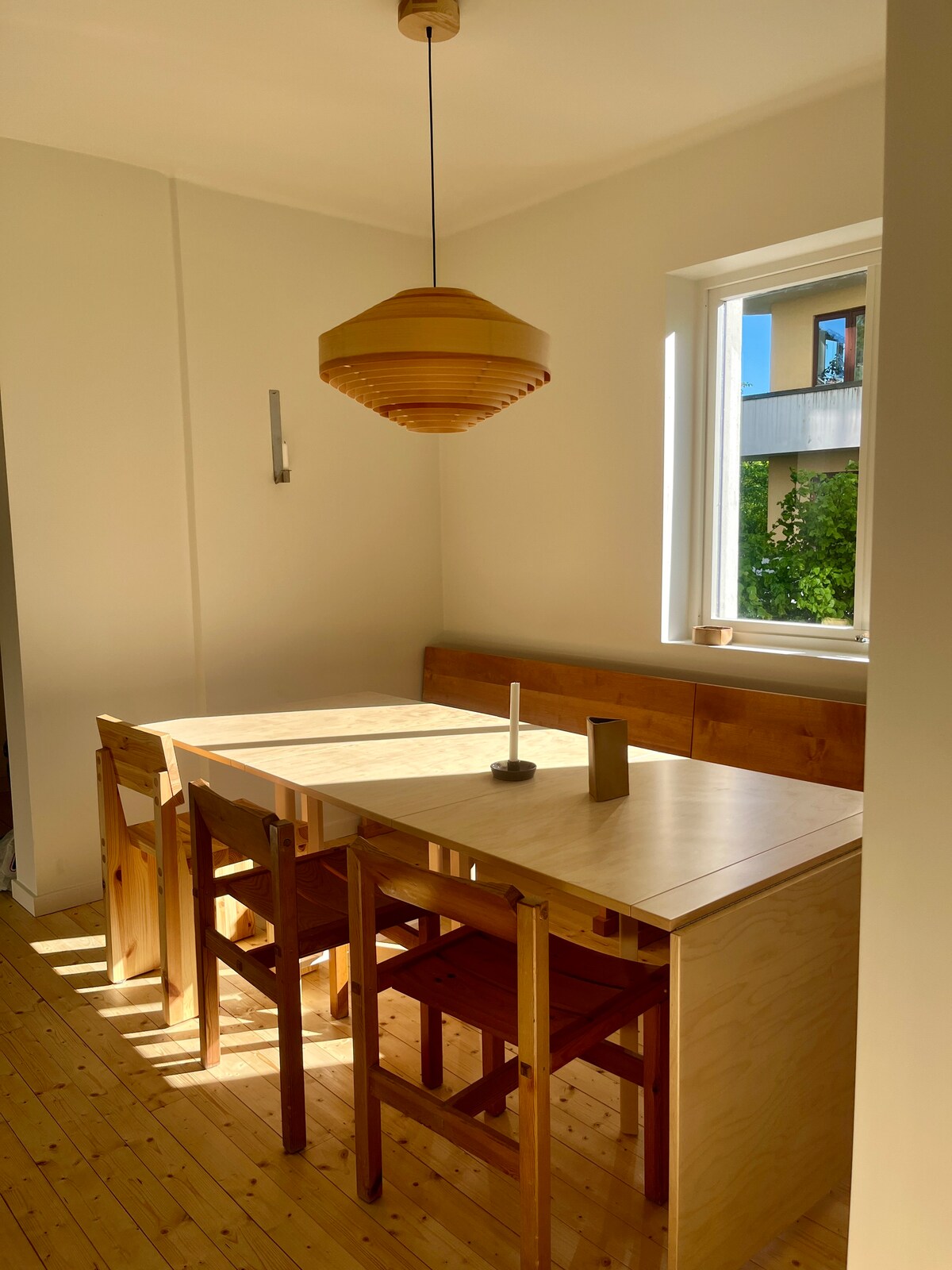 Classic apartment in nordic design. Facing a quiet garden w/flowers and fruittrees. A beautiful vibrant neighbourhood. Spacious livingroom: TV w/chromecast, fireplace, table for dinner & work. Sofa. Kitchen: Dishwasher, washingmachine, supplies for cooking and baking, Moccamaster, french press, coffegrinder, kettle. Bedroom 1: Double bed 160x200 Bedroom 2: 2 beds 90x200 / bunk for adults Small functional bathroom. For your baby: High chair, travel cot, changing pad, stroller.