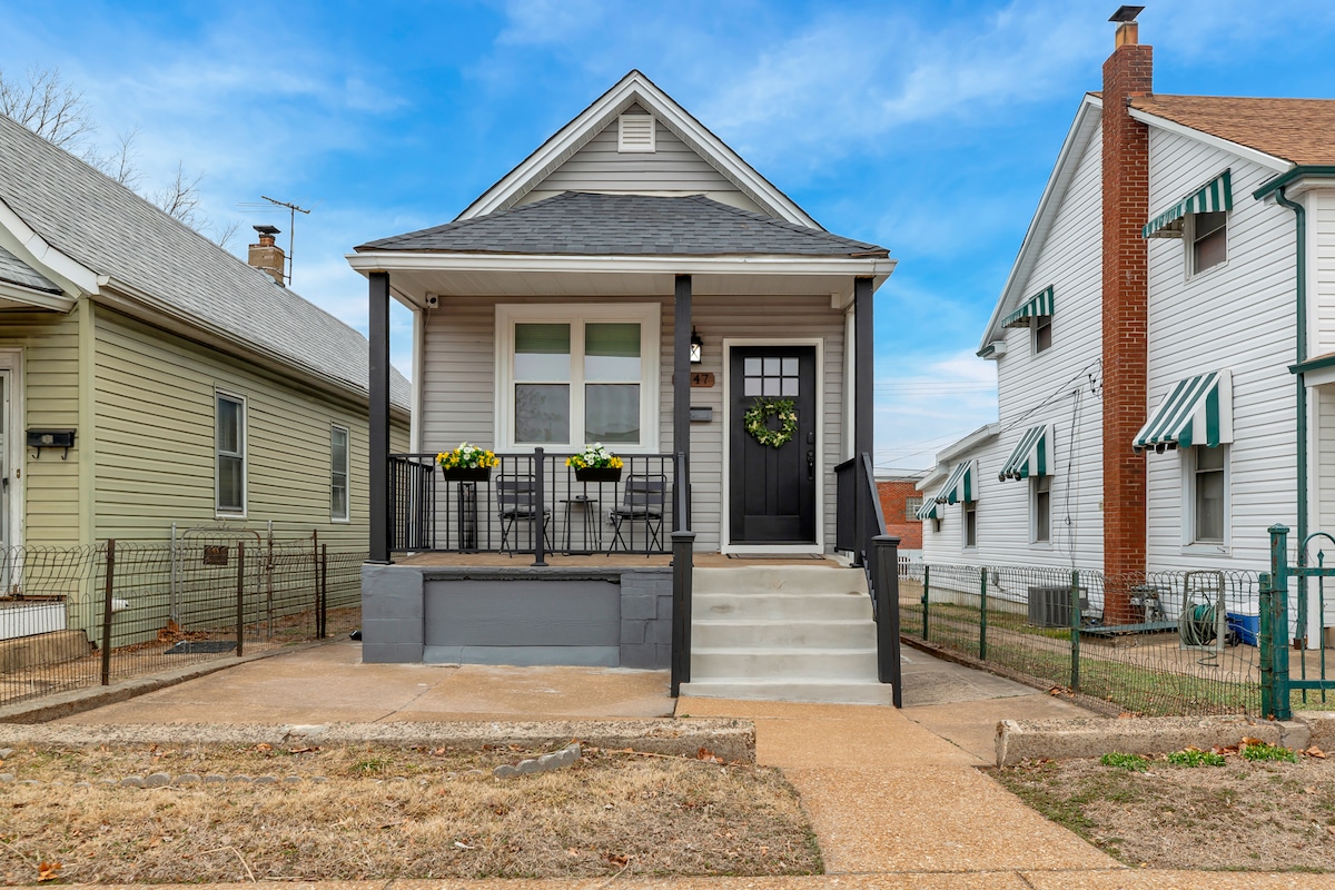 **FAMILIEVENNLIG** (se detaljer for elementene som er tilgjengelige for familier) Dette hjemmet med to soverom har alt du trenger for en avslappende tur! Fullt oppdatert med stilige og komfortable møbler og innredning. Fullt utstyrt kjøkken og en fantastisk bakgård/terrasse. Stille gate ved en av de beste meksikanske restaurantene i St. Louis – Hacienda – (kan gå to minutter dit). I nærheten av alt! 13 minutter til St. Louis Zoo. Ti minutter til The Magic House. 15 minutter til Busch Stadium og Union Station.