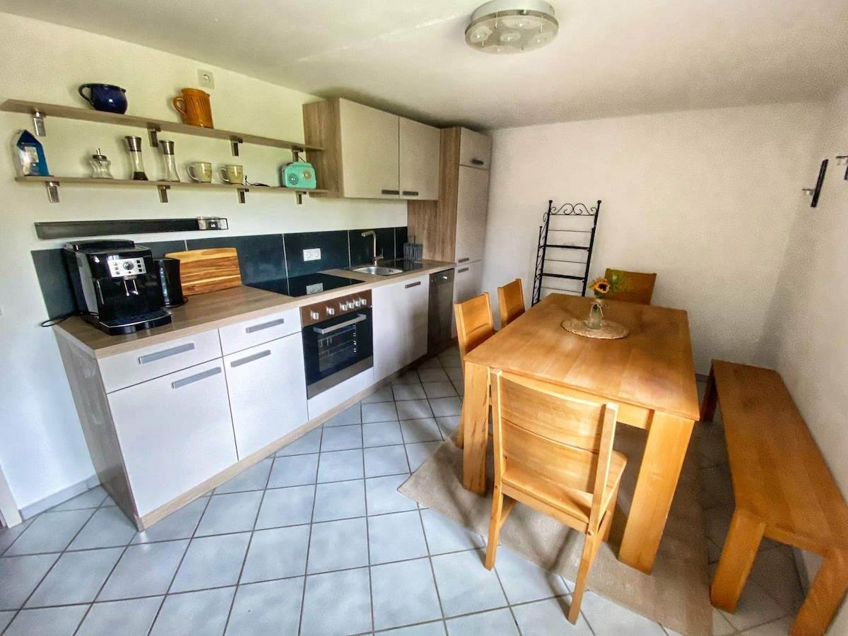Velkommen til den rolige frankiske skogen! Den koselige leiligheten vår i et boligkompleks har plass til 1–6 personer og er ideell for de som søker natur og avslapning. Leiligheten har fullt utstyrt kjøkken, bad, fire soverom, terrasse og stue med TV. Vakre turstier og frisk skogsluft venter rett utenfor døren. Nyt avslappende dager borte fra travelheten – perfekt for å slappe av og lade opp.