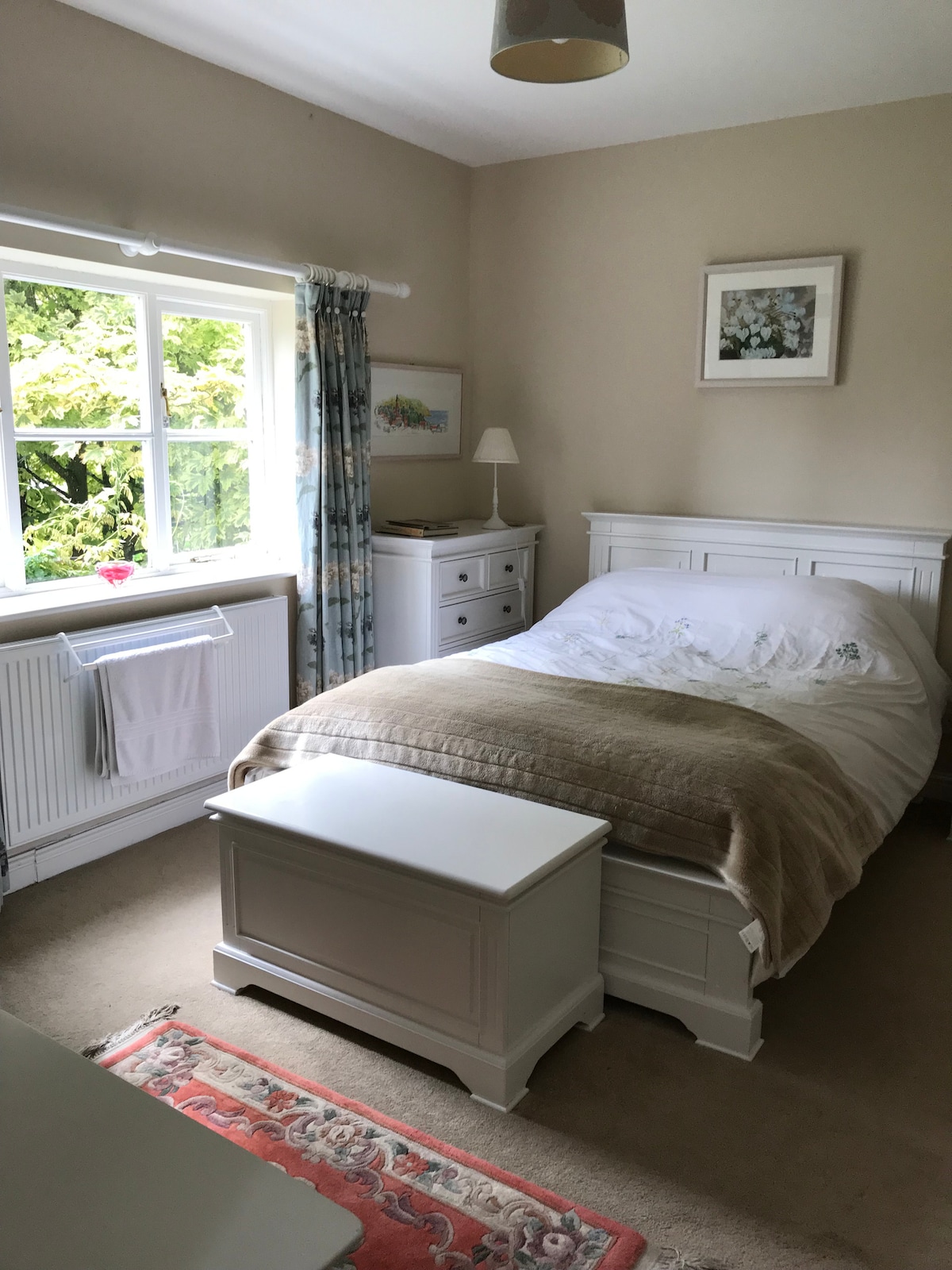 Hageutsikt: dobbeltseng og eget bad.